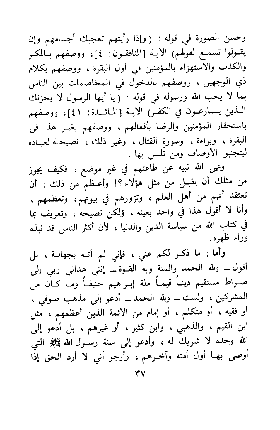 وأما ما ذكر لكم عني، فإني لم آته بجهالة، بل أقول - ولله الحمد والمنة وبه القوة -: إنني هداني ربي إلى صراط مستقيم دينا قيما ملة إبراهيم حنيفا وما كان من المشركين، ولست - ولله الحمد - أدعو إلى مذهب صوفي، أو فقيه، أو متكلم، أو إمام من الأئمة الذين أعظمهم، مثل ابن القيم، والذهبي، وابن كثير، أو غيرهم، بل أدعو إلى الله وحده لا شريك له، وأدعو إلى سنة رسول الله صلى الله عليه وسلم التي أوصى بها أول أمته وآخرهم، وأرجو أني لا أرد الحق إذا