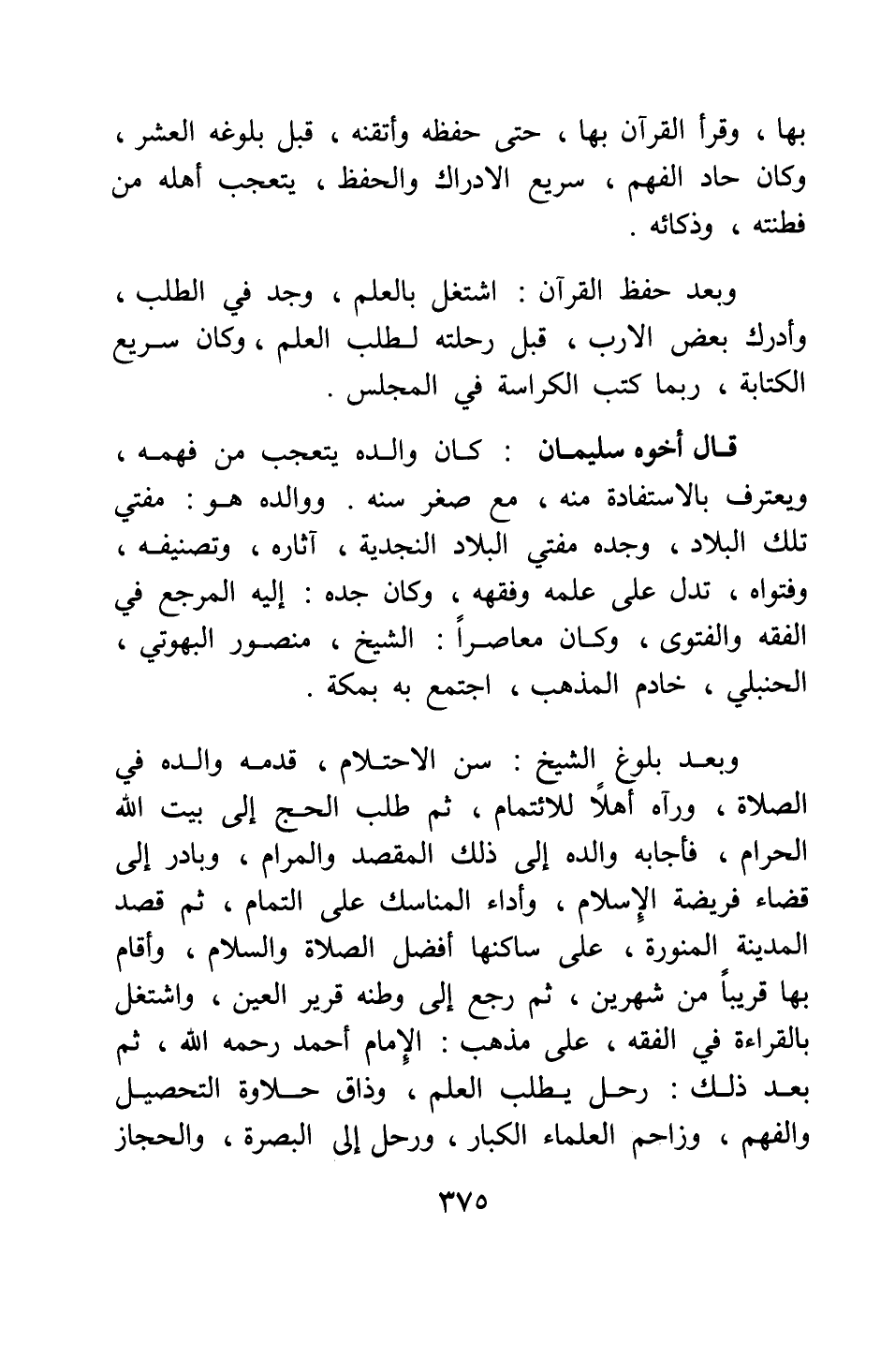 وبعد بلوغ الشيخ سن الاحتلام، قدمه والده في الصلاة، ورآه أهلا للائتمام. ثم طلب الحج إلى بيت الله الحرام، فأجابه والده إلى ذلك المقصد والمرام وبادر إلى قضاء فريضة الإسلام، وأداء المناسك على التمام. ثم قصد المدينة المنورة على ساكنها أفضل الصلاة والسلام، وأقام بها قريبا من شهرين. ثم رجع إلى وطنه قرير العين، واشتغل بالقراءة في الفقه، على مذهب الإمام أحمد رحمه الله. ثم بعد ذلك رحل يطلب العلم، وذاق حلاوة التحصيل والفهم، وزاحم العلماء الكبار، ورحل إلى البصرة والحجاز