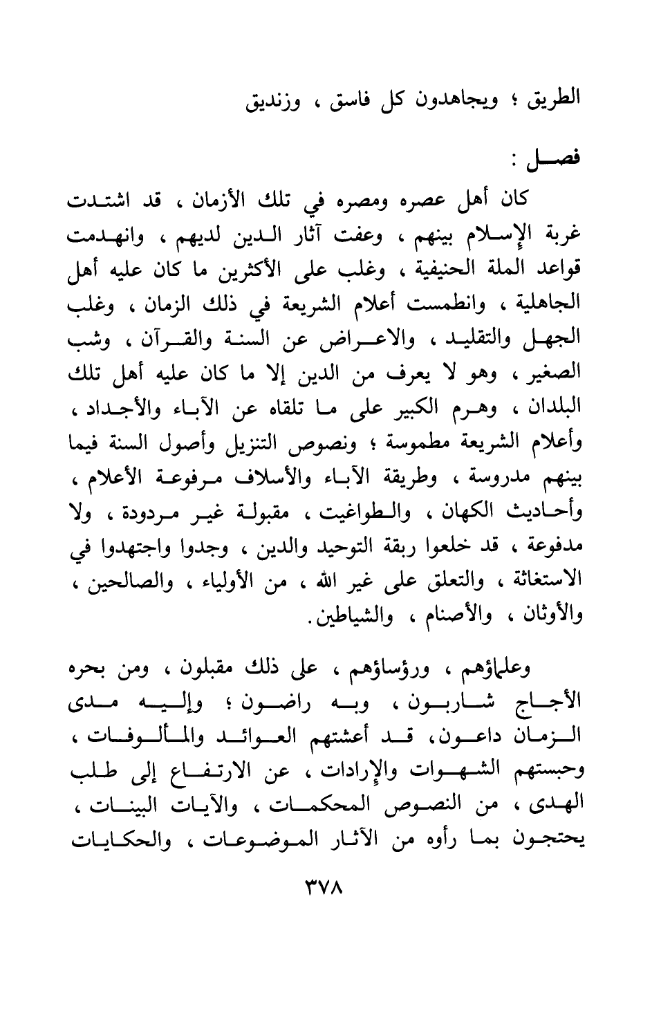 كان أهل عصره ومصره في تلك الأزمان، قد اشتدت غربة الإسلام بينهم، وعفت آثار الدين لديهم، وانهدمت قواعد الملة الحنيفية وغلب على الأكثرين ما كان عليه أهل الجاهلية، وانطمست أعلام الشريعة في ذلك الزمان، وغلب الجهل والتقليد والإعراض عن السنة والقرآن، وشب الصغير وهو لا يعرف من الدين إلا ما كان عليه أهل تلك البلدان، وهرم الكبير على ما تلقاه عن الآباء والأجداد، وأعلام الشريعة مطموسة، ونصوص التنْزيل وأصول السنة فيما بينهم مدروسة، وطريقة الآباء والأسلاف مرفوعة الأعلام، وأحاديث الكهان والطواغيت مقبولة غير مردودة، ولا مدفوعة، قد خلعوا ربقة التوحيد والدين، وجدوا واجتهدوا في الاستغاثة، والتعلق على غير الله، من الأولياء والصالحين، والأوثان والأصنام والشياطين.