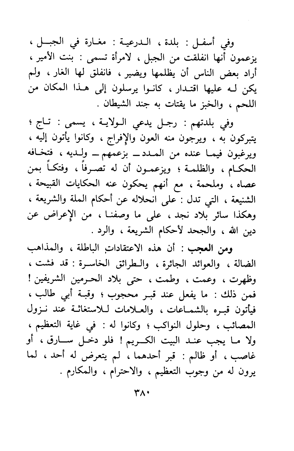 ومن العجب أن هذه الاعتقادات الباطلة، والمذاهب الضالة، والعوائد الجائرة، والطرائق الخاسرة قد فشت وظهرت، وعمت وطمت، حتى بلاد الحرمين الشريفين! فمن ذلك: ما يفعل عند قبر محجوب، وقبة أبي طالب، فيأتون قبره بالشماعات والعلامات للاستغاثة عند نزول المصائب، وحلول النواكب، وكانوا له في غاية التعظيم، ولا ما يجب عند البيت الكريم! فلو دخل سارق أو غاصب أو ظالم قبر أحدهما، لم يتعرض له أحد، لما يرون له من وجوب التعظيم والاحترام والمكارم.