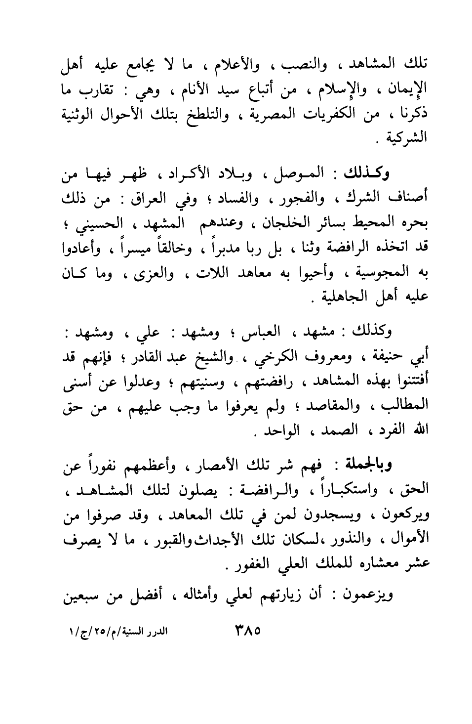 وكذلك الموصل، وبلاد الأكراد، ظهر فيها من أصناف الشرك والفجور والفساد. وفي العراق من ذلك بحره المحيط بسائر الخلجان، وعندهم المشهد الحسيني، قد اتخذه الرافضة وثنا، بل ربا مدبرا وخالقا ميسرا، وأعادوا به المجوسية، وأحيوا به معاهد اللات والعزى، وما كان عليه أهل الجاهلية.