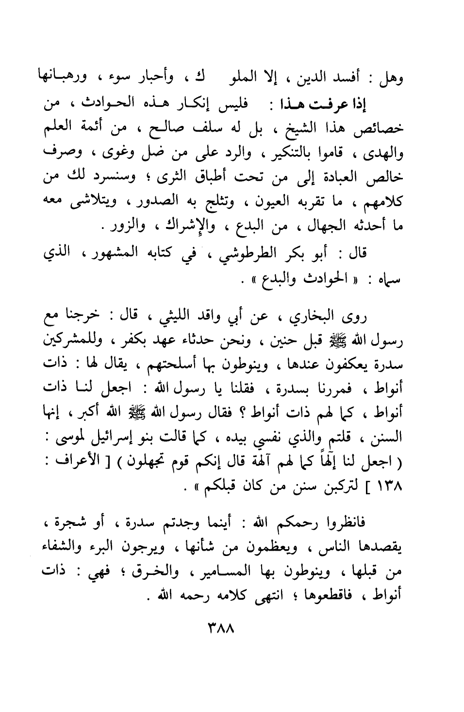 فانظروا رحمكم الله، أينما وجدتم سدرة أو شجرة يقصدها الناس، ويعظمون من شأنها، ويرجون البرء والشفاء من قبلها، وينوطون بها المسامير والخرق; فهي: ذات أنواط، فاقطعوها; انتهى كلامه رحمه الله.