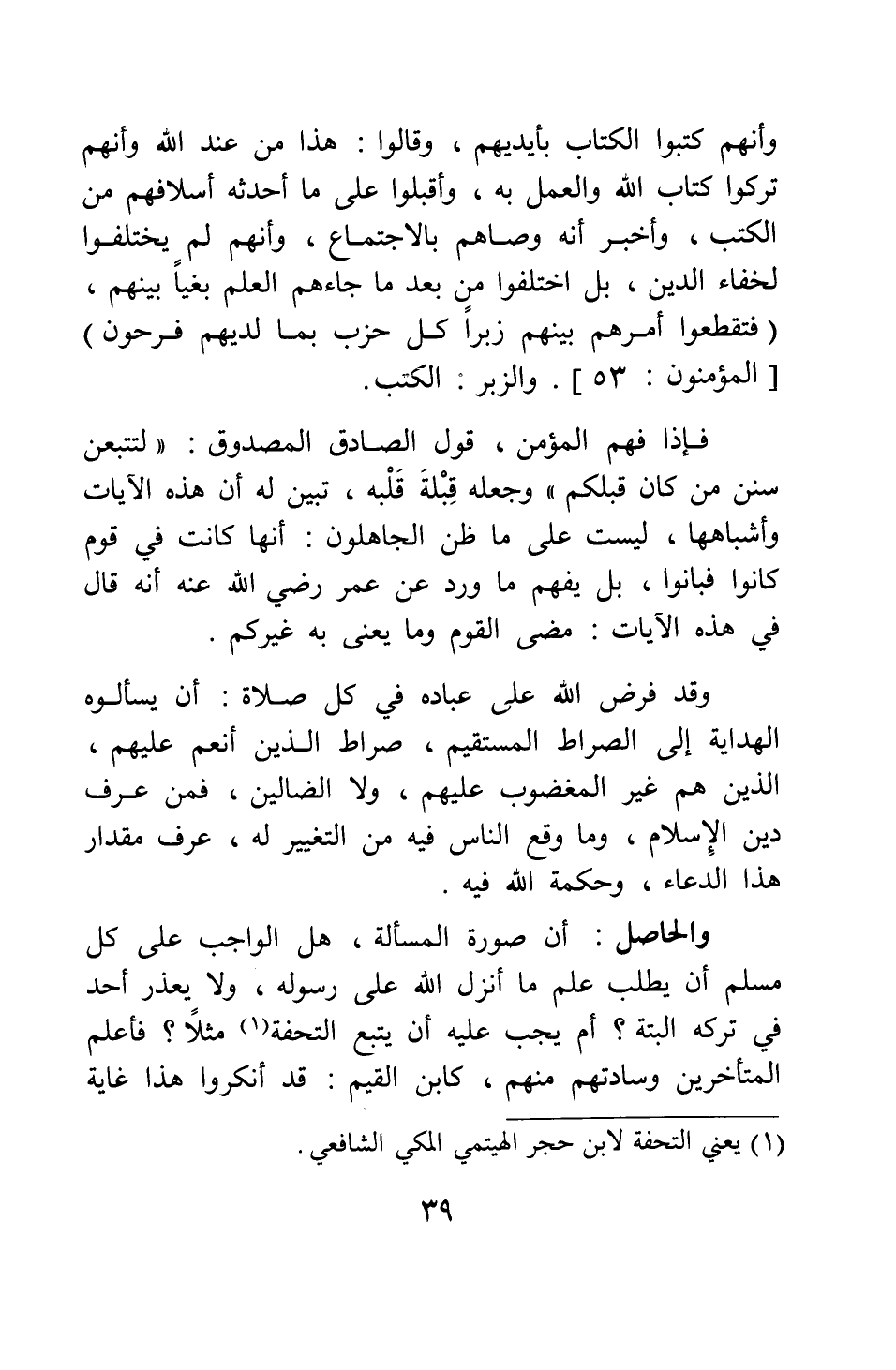 والحاصل: أن صورة المسألة، هل الواجب على كل مسلم أن يطلب علم ما أنزل الله على رسوله، ولا يعذر أحد في تركه البتة؟ أم يجب عليه أن يتبع التحفة 2 مثلا؟ فأعلم المتأخرين وسادتهم منهم، كابن القيم قد أنكروا هذا غاية