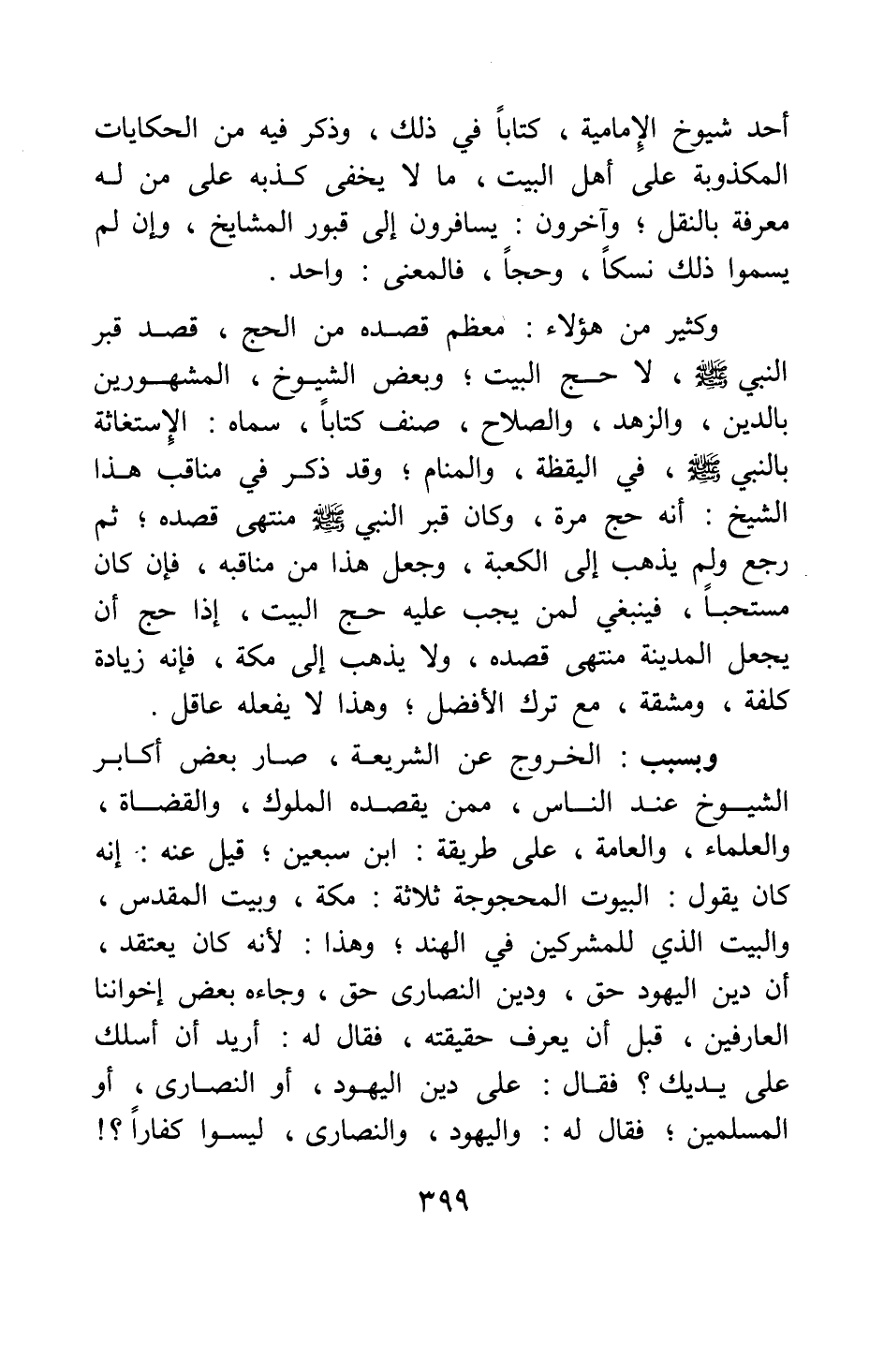 أحد شيوخ الإمامية، كتابا في ذلك، وذكر فيه من الحكايات المكذوبة على أهل البيت، ما لا يخفى كذبه على من له معرفة بالنقل. وآخرون يسافرون إلى قبور المشايخ، وإن لم يسموا ذلك نسكاوحجا، فالمعنى واحد. وكثير من هؤلاء معظم قصده من الحج، قصد قبر النبي صلى الله عليه وسلم، لا حج البيت. وبعض الشيوخ، المشهورين بالدين، والزهد والصلاح، صنف كتابا سماه: الاستغاثة بالنبي صلى الله عليه وسلم في اليقظة والمنام؛ وقد ذكر في مناقب هذا الشيخ: أنه حج مرة، وكان قبر النبي صلى الله عليه وسلم منتهى قصده، ثم رجع ولم يذهب إلى الكعبة، وجعل هذا من مناقبه، فإن كان مستحبا، فينبغي لمن يجب عليه حج البيت، إذا حج أن يجعل المدينة منتهى قصده، ولا يذهب إلى مكة، فإنه زيادة كلفة ومشقة، مع ترك الأفضل; وهذا لا يفعله عاقل.