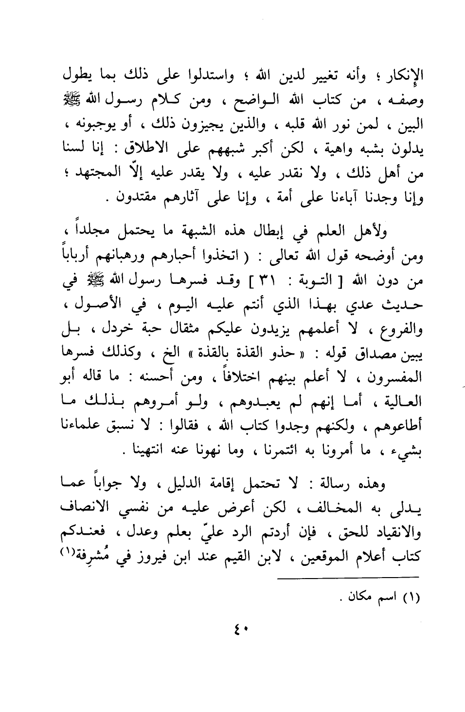 ولأهل العلم في إبطال هذه الشبهة ما يحتمل مجلدا، ومن أوضحه قول الله تعالى: {اتَّخَذُوا أَحْبَارَهُمْ وَرُهْبَانَهُمْ أَرْبَاباً مِنْ دُونِ اللَّهِ} ، [سورة التوبة آية: 31] . وقد فسرها رسول الله صلى الله عليه وسلم في حديث عدي بهذا الذي أنتم عليه اليوم، في الأصول، والفروع، لا أعلمهم يزيدون عليكم مثقال حبة خردل، بل يبين مصداق قوله: " حذو القذة بالقذة " 1 إلخ. وكذلك فسرها المفسرون، لا أعلم بينهم اختلافا، ومن أحسنه: ما قاله أبو العالية، أما إنهم لم يعبدوهم، ولو أمروهم بذلك ما أطاعوهم، ولكنهم وجدوا كتاب الله، فقالوا: لا نسبق علماءنا بشيء، ما أمرونا به ائتمرنا، وما نهونا عنه انتهينا.