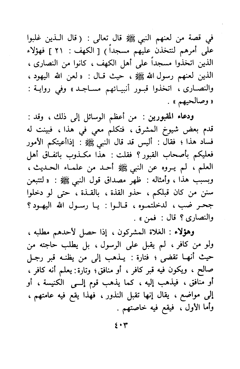 في قصة من لعنهم النبي صلى الله عليه وسلم قال تعالى: {قَالَ الَّذِينَ غَلَبُوا عَلَى أَمْرِهِمْ لَنَتَّخِذَنَّ عَلَيْهِمْ مَسْجِداً} [سورة الكهف آية: 21] ، فهؤلاء الذين اتخذوا مسجدا على أهل الكهف كانوا من النصارى، الذين لعنهم رسول الله صلى الله عليه وسلم حيث قال: " لعن الله اليهود والنصارى، اتخذوا قبور أنبيائهم مساجد " 1 وفي رواية: وصالحيهم.