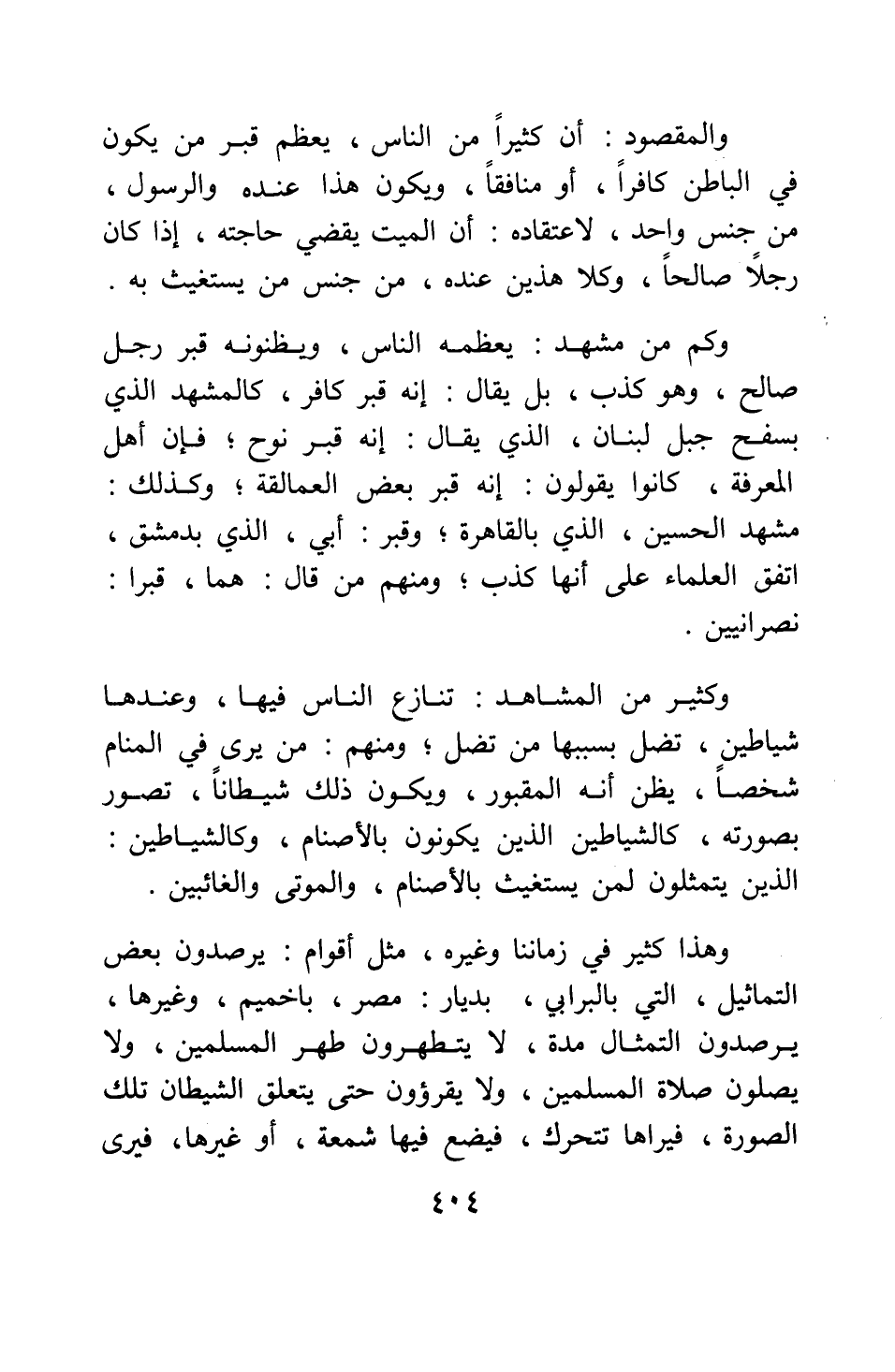 وكثير من المشاهد تنازع الناس فيها، وعندها شياطين، تضل بسببها من تضل. ومنهم من يرى في المنام شخصا يظن أنه المقبور، ويكون ذلك شيطانا تصور بصورته، كالشياطين الذين يكونون بالأصنام، وكالشياطين الذين يتمثلون لمن يستغيث بالأصنام والموتى والغائبين، وهذا كثير في زماننا وغيره، مثل أقوام يرصدون بعض التماثيل، التي بالبراري بديار مصر، بإخميم، وغيرها، يرصدون التمثال مدة، لا يتطهرون طهر المسلمين، ولا يصلون صلاة المسلمين، ولا يقرؤون حتى يتعلق الشيطان تلك الصورة، فيراها تتحرك، فيضع فيها شمعة، أو غيرها، فيرى