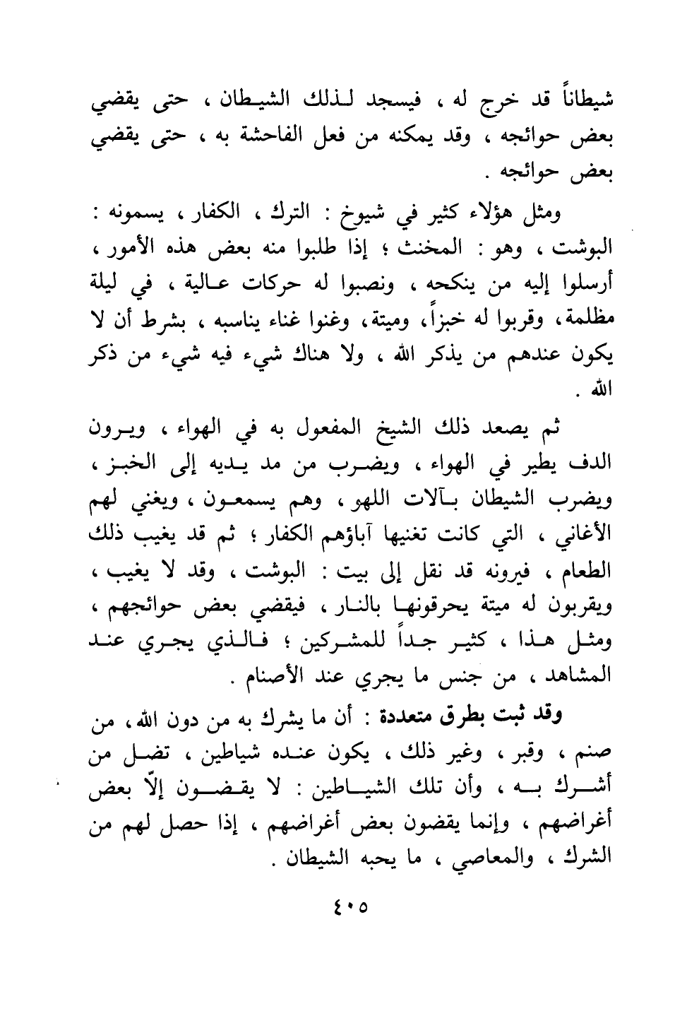 شيطانا قد خرج له، فيسجد لذلك الشيطان، حتى يقضي بعض حوائجه، وقد يمكنه من فعل الفاحشة به، حتى يقضي بعض حوائجه. ومثل هؤلاء كثير في شيوخ الترك الكفار، يسمونه: البوشت، وهو: المخنث، إذا طلبوا منه بعض هذه الأمور، أرسلوا إليه من ينكحه، ونصبوا له حركات عالية، في ليلة مظلمة، وقربوا له خبزا، وميتة، وغنوا غناء يناسبه، بشرط أن لا يكون عندهم من يذكر الله، ولا هناك شيء فيه شيء من ذكر الله.
