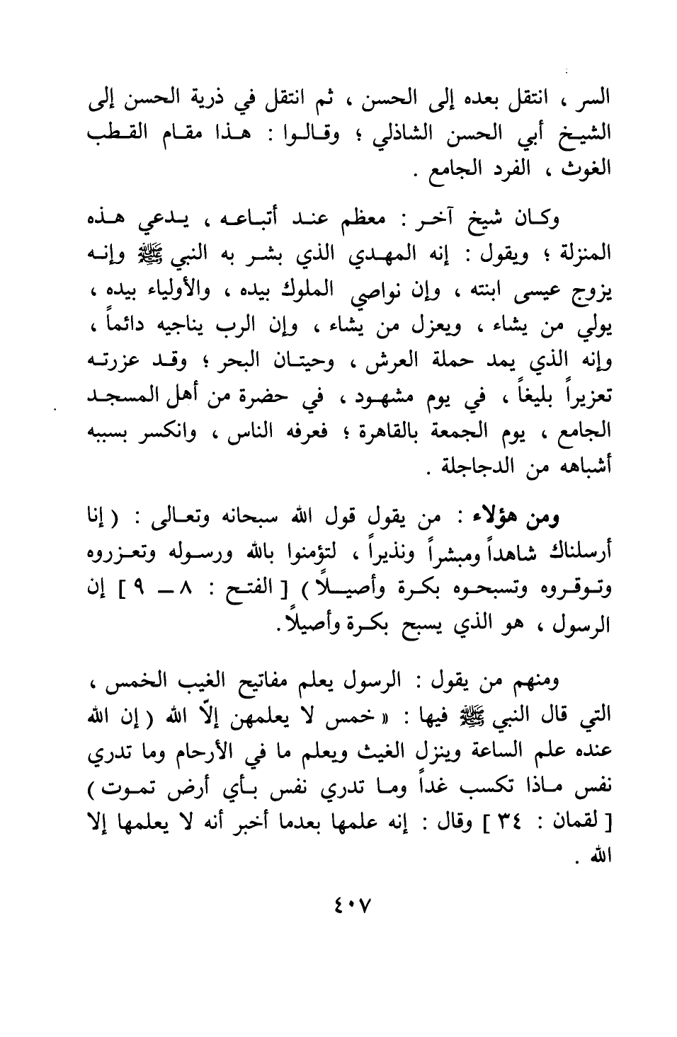 ومنهم من يقول: الرسول يعلم مفاتيح الغيب الخمس، التي قال النبي صلى الله عليه وسلم فيها: " خمس لا يعلمهن إلا الله {إِنَّ اللَّهَ عِنْدَهُ عِلْمُ السَّاعَةِ وَيُنَزِّلُ الْغَيْثَ وَيَعْلَمُ مَا فِي الْأَرْحَامِ وَمَا تَدْرِي نَفْسٌ مَاذَا تَكْسِبُ غَدًا وَمَا تَدْرِي نَفْسٌ بِأَيِّ أَرْضٍ تَمُوتُ} " 1، وقال: إنه علمها بعدما أخبر أنه لا يعلمها إلا الله.