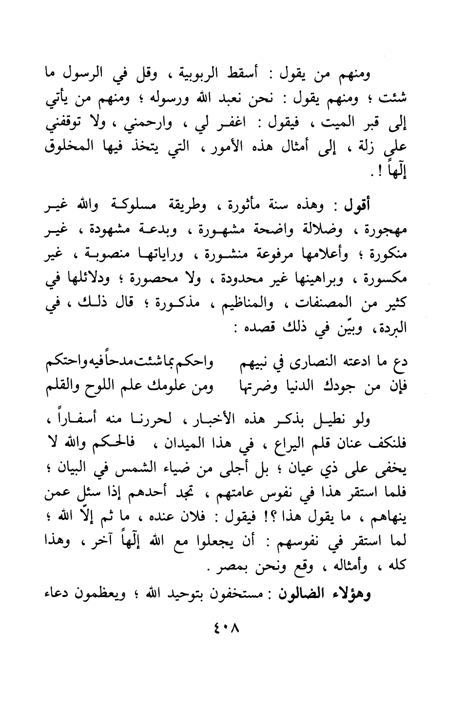 ومنهم من يقول: أسقط الربوبية، وقل في الرسول ما شئت، ومنهم يقول: نحن نعبد الله ورسوله ومنهم من يأتي إلى قبر الميت، فيقول: اغفر لي، وارحمنى، ولا توقفني على زلة، إلى أمثال هذه الأمور، التي يتخذ فيها المخلوق إلها.