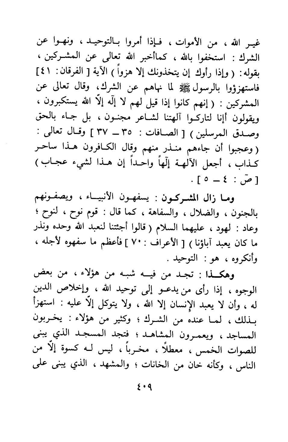 وهكذا تجد من فيه شبه من هؤلاء من بعض الوجوه، إذا رأى من يدعو إلى توحيد الله وإخلاص الدين له، وأن لا يعبد الإنسان إلا الله، ولا يتوكل إلا عليه، استهزأ بذلك، لما عنده من الشرك. وكثير من هؤلاء يخربون المساجد، ويعمرون المشاهد، فتجد المسجد الذي يبنى للصلوات الخمس معطلا، مخربا، ليس له كسوة إلا من الناس، وكأنه خان من الخانات، والمشهد الذي يبنى على