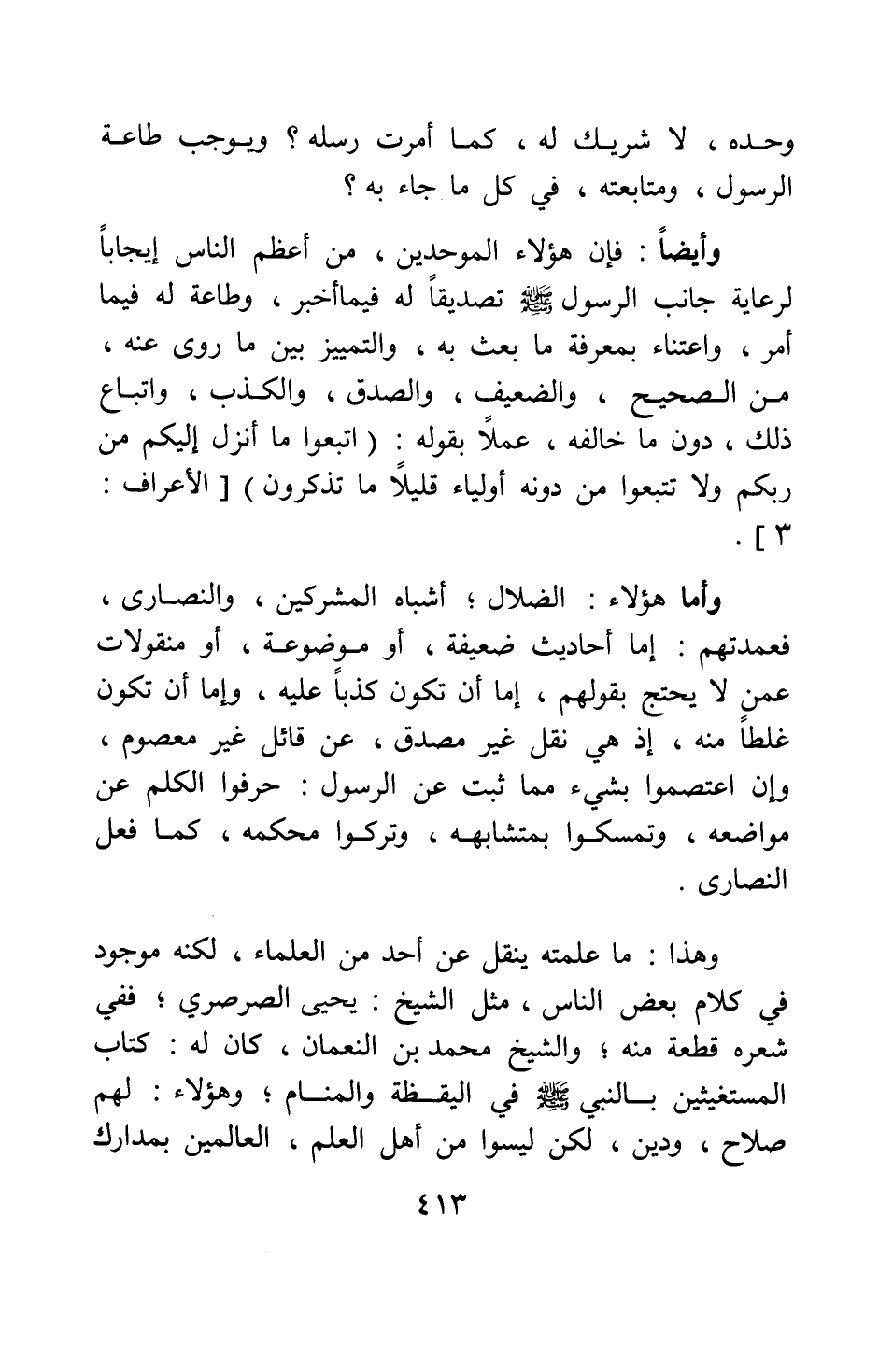 وحده، لا شريك له، كما أمرت رسله، ويوجب طاعة الرسول، ومتابعته، في كل ما جاء به؟ وأيضا فإن هؤلاء الموحدين، من أعظم الناس إيجابا لرعاية جانب الرسول صلى الله عليه وسلم تصديقا له فيما أخبر، وطاعة له فيما أمر، واعتناء بمعرفة ما بعث به، والتمييز بين ما روي عنه، من الصحيح والضعيف، والصدق والكذب، واتباع ذلك، دون ما خالفه، عملا بقوله: {اتَّبِعُوا مَا أُنْزِلَ إِلَيْكُمْ مِنْ رَبِّكُمْ وَلا تَتَّبِعُوا مِنْ دُونِهِ أَوْلِيَاءَ قَلِيلاً مَا تَذَكَّرُونَ} [سورة الأعراف آية: 3] . وأما هؤلاء: الضلال، أشباه المشركين والنصارى، فعمدتهم: إما أحاديث ضعيفة، أو موضوعة، أو منقولات عمن لا يحتج بقولهم، إما أن تكون كذبا عليه، وإما أن تكون غلطا منه، إذ هي نقل غير مصدق، عن قائل غير معصوم، وإن اعتصموا بشيء مما ثبت عن الرسول، حرفوا الكلم عن مواضعه، وتمسكوا بمتشابهه، وتركوا محكمه، كما فعل النصارى.