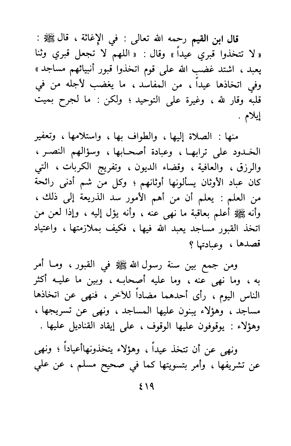 قال ابن القيم رحمه الله تعالى في الإغاثة: قال صلى الله عليه وسلم: " لا تتخذوا قبري عيدا " 1، وقال: " اللهم لا تجعل قبري وثنا يعبد. اشتد غضب الله على قوم اتخذوا قبور أنبيائهم مساجد " 2. وفي اتخاذها عيدا من المفاسد، ما يغضب لأجله من في قلبه وقار لله، وغيرة على التوحيد، ولكن ما لجرح بميت إيلام.