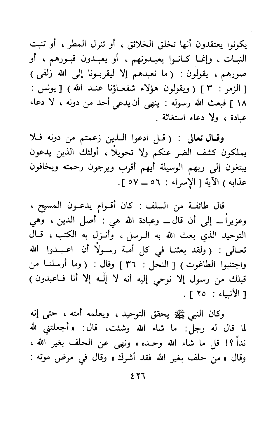 يكونوا يعتقدون أنها تخلق الخلائق، أو تنَزل المطر، أو تنبت النبات، وإنما كانوا يعبدونهم، أو يعبدون قبورهم، أو صورهم، يقولون: {مَا نَعْبُدُهُمْ إِلاَّ لِيُقَرِّبُونَا إِلَى اللَّهِ زُلْفَى} [سورة الزمر آية: 3] ، {وَيَقُولُونَ هَؤُلاءِ شُفَعَاؤُنَا عِنْدَ اللَّهِ} [سورة يونس آية: 18] ؛ فبعث الله رسوله ينهى أن يدعى أحد من دونه، لا دعاء عبادة، ولا دعاء استغاثة.