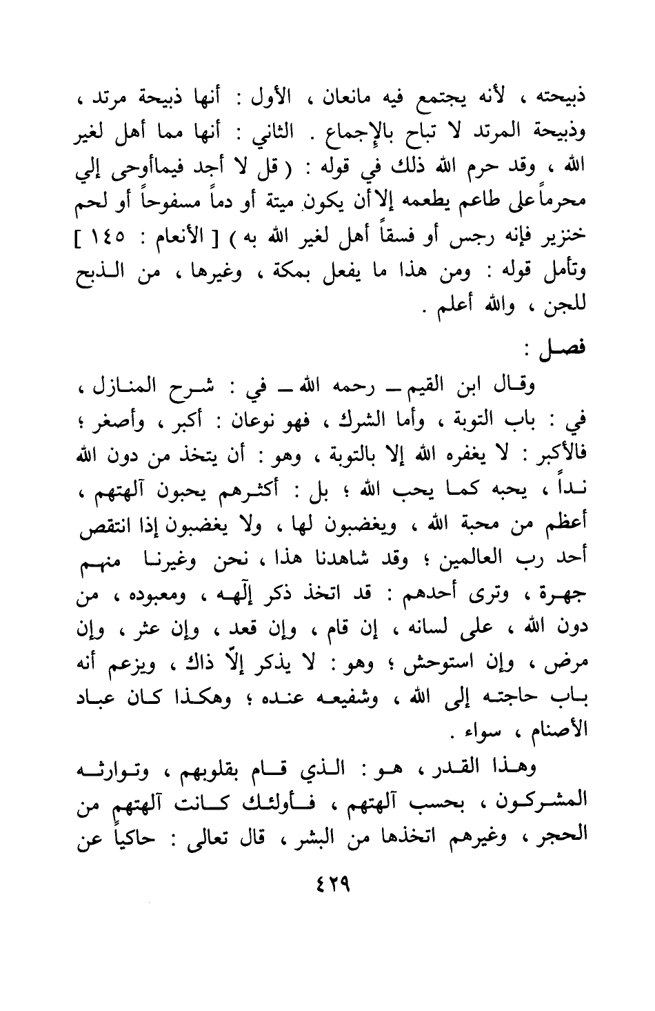 وقال ابن القيم- رحمه الله- في: شرح المنازل، في: باب التوبة: وأما الشرك فهو نوعان: أكبر، وأصغر. فالأكبر: لا يغفره الله إلا بالتوبة، وهو: أن يتخذ من دون الله ندا، يحبه كما يحب الله، بل أكثرهم يحبون آلهتهم، أعظم من محبة الله، ويغضبون لها، ولا يغضبون إذا انتقص أحد رب العالمين؛ وقد شاهدنا هذا، نحن وغيرنا منهم جهرة. وترى أحدهم قد اتخذ ذكر إلهه ومعبوده من دون الله، على لسانه، إن قام، وإن قعد، وإن عثر، وإن مرض، وإن استوحش؛ وهو: لا يذكر إلا ذاك، ويزعم أنه باب حاجته إلى الله، وشفيعه عنده وهكذا كان عباد الأصنام، سواء.