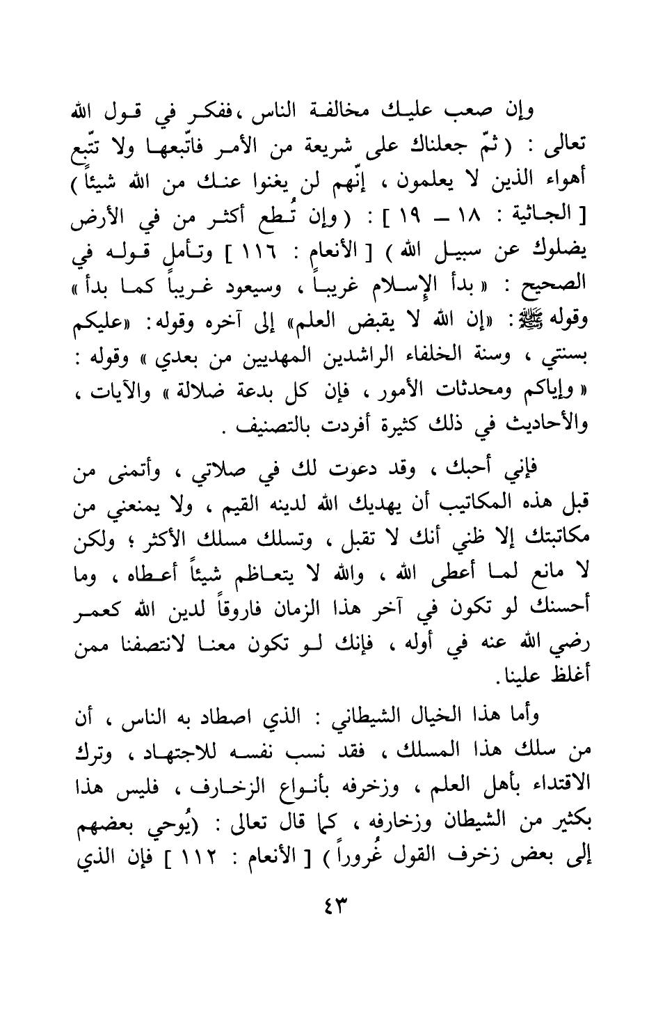 وتأمل قوله في الصحيح: " بدأ الإسلام غريبا، وسيعود غريبا كما بدأ " 1 وقوله صلى الله عليه وسلم: " إن الله لا يقبض العلم " 2 إلى آخره، وقوله: " عليكم بسنتي، وسنة الخلفاء الراشدين المهديين من بعدي " وقوله: " وإياكم ومحدثات الأمور، فإن كل بدعة ضلالة " 3. والآيات، والأحاديث في ذلك كثيرة أفردت بالتصنيف.