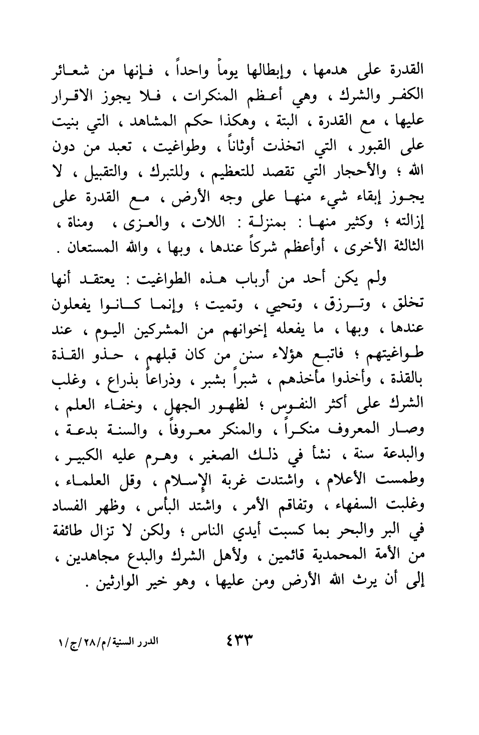 القدرة على هدمها وإبطالها يوما واحدا، فإنها من شعائر الكفر والشرك، وهي أعظم المنكرات، فلا يجوز الإقرار عليها، مع القدرة، البتة، وهكذا حكم المشاهد، التي بنيت على القبور، التي اتخذت أوثانا، وطواغيت، تعبد من دون الله، والأحجار التي تقصد للتعظيم، وللتبرك، والتقبيل، لا يجوز إبقاء شيء منها على وجه الأرض، مع القدرة على إزالته، وكثير منها بمنْزلة اللات، والعزى، ومناة، الثالثة الأخرى، أو أعظم شركا عندها، وبها، والله المستعان.