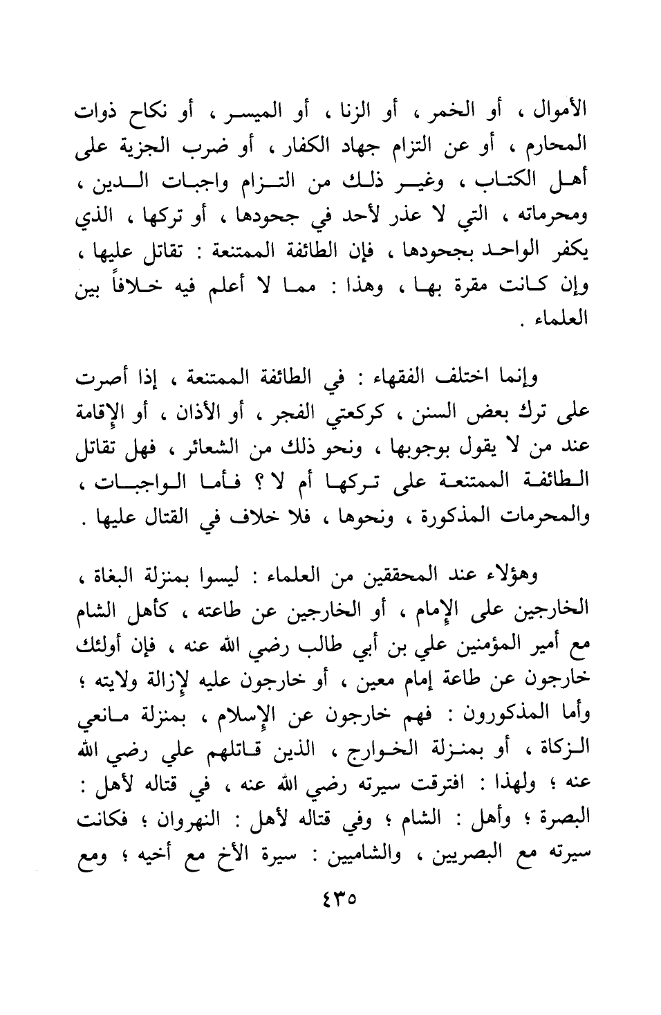 الأموال، أو الخمر، أو الزنى، أو الميسر، أو نكاح ذوات المحارم، أو عن التزام جهاد الكفار، أو ضرب الجزية على أهل الكتاب، وغير ذلك من التزام واجبات الدين ومحرماته، التي لا عذر لأحد في جحودها أو تركها، الذي يكفر الواحد بجحودها، فإن الطائفة الممتنعة تقاتل عليها، وإن كانت مقرة بها؛ وهذا مما لا أعلم فيه خلافا بين العلماء.