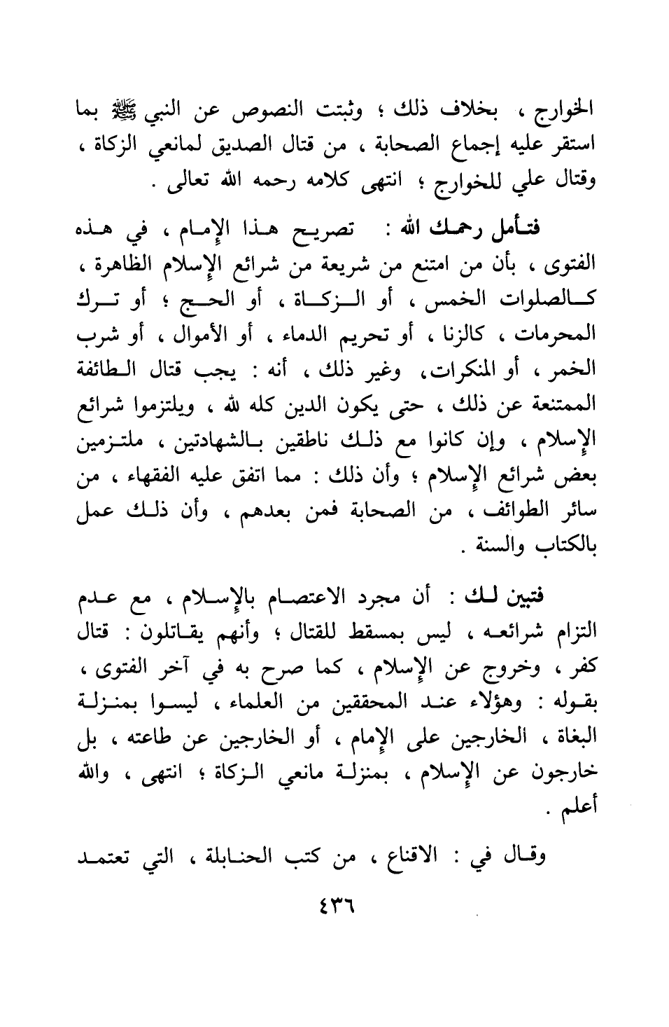 فتأمل رحمك الله تصريح هذا الإمام، في هذه الفتوى، بأن من امتنع من شريعة من شرائع الإسلام الظاهرة، كالصلوات الخمس، أو الزكاة، أو الحج; أو ترك المحرمات، كالزنى، أو تحريم الدماء، أو الأموال، أو شرب الخمر، أو المنكرات، وغير ذلك، أنه يجب قتال الطائفة الممتنعة عن ذلك، حتى يكون الدين كله لله، ويلتزموا شرائع الإسلام، وإن كانوا مع ذلك ناطقين بالشهادتين، ملتزمين بعض شرائع الإسلام؛ وأن ذلك مما اتفق عليه الفقهاء من سائر الطوائف، من الصحابة فمن بعدهم، وإن ذلك عمل بالكتاب والسنة. فتبين لك أن مجرد الاعتصام بالإسلام، مع عدم التزام شرائعه، ليس بمسقط للقتال، وأنهم يقاتلون قتال كفر وخروج عن الإسلام، كما صرح به في آخر الفتوى بقوله: وهؤلاء عند المحققين من العلماء ليسوا بمنْزلة البغاة الخارجين على الإمام، أو الخارجين عن طاعته، بل خارجون عن الإسلام، بمنْزلة مانعي الزكاة. انتهى، والله أعلم.