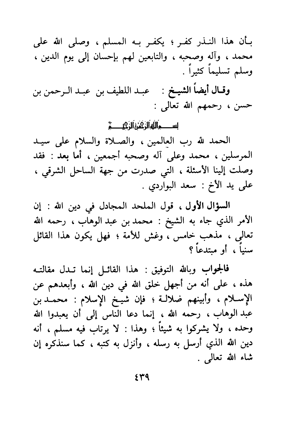 وقال أيضا الشيخ: عبد اللطيف بن عبد الرحمن بن حسن، رحمهم الله تعالى: