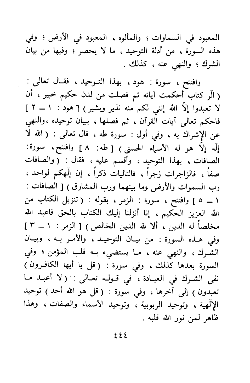 وافتتح سورة هود بهذا التوحيد، فقال تعالى: {الر كِتَابٌ أُحْكِمَتْ آيَاتُهُ ثُمَّ فُصِّلَتْ مِنْ لَدُنْ حَكِيمٍ خَبِيرٍ أَلاّ تَعْبُدُوا إِلاّ اللهَ إِنَّنِي لَكُمْ مِنْهُ نَذِيرٌ وَبَشِيرٌ} فأحكم تعالى آيات القرآن، ثم فصلها، ببيان توحيده، والنهي عن الإشراك به، وفي أول: سورة طه، قال تعالى: {اللَّهُ لا إِلَهَ إِلاَّ هُوَ لَهُ الْأَسْمَاءُ الْحُسْنَى} [سورة طه آية: 8] وافتتح، سورة الصافات بهذا التوحيد، وأقسم عليه، فقال: {وَالصَّافَّاتِ صَفّاً فَالزَّاجِرَاتِ زَجْراً فَالتَّالِيَاتِ ذِكْراً إِنَّ إِلَهَكُمْ لَوَاحِدٌ رَبُّ السَّمَاوَاتِ وَالأَرْضِ وَمَا بَيْنَهُمَا وَرَبُّ الْمَشَارِقِ} [سورة الصافات آية: 1-2-3] وافتتح، سورة: الزمر، بقوله: {تَنْزِيلُ الْكِتَابِ مِنَ اللَّهِ الْعَزِيزِ الْحَكِيمِ إِنَّا أَنْزَلْنَا إِلَيْكَ الْكِتَابَ بِالْحَقِّ فَاعْبُدِ اللَّهَ مُخْلِصاً لَهُ الدِّينَ أَلا لِلَّهِ الدِّينُ الْخَالِصُ} [سورة الزمر آية: 1-2-3] وفي هذه السورة من بيان التوحيد والأمر به، وبيان الشرك والنهي عنه، ما يستضيء به قلب المؤمن. وفي السورة بعدها كذلك، وفي سورة {قُلْ يَا أَيُّهَا الْكَافِرُونَ} [سورة الكافرون آية: 1] نفي الشرك في العبادة، في قوله تعالى: {لا أَعْبُدُ مَا تَعْبُدُونَ} [سورة الكافرون آية: 2] إلى آخرها، وفي سورة: {قُلْ هُوَ اللَّهُ أَحَدٌ} [سورة الإخلاص آية: 1] توحيد الإلهية، وتوحيد الربوبية، وتوحيد الأسماء والصفات؛ وهذا ظاهر لمن نور الله قلبه.
