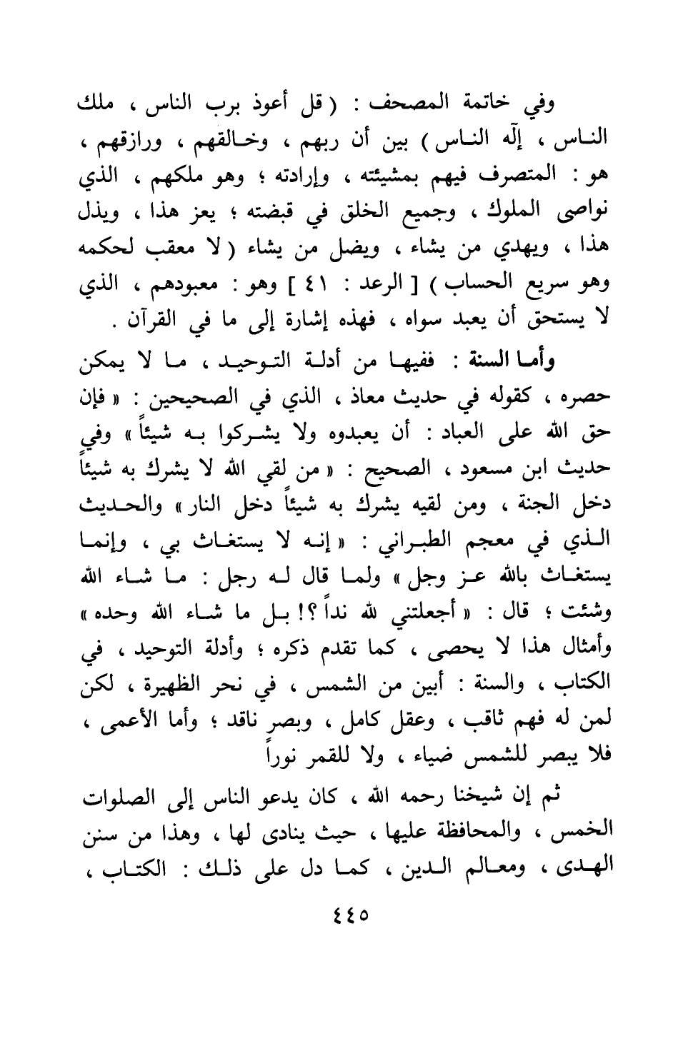 وأما السنة: ففيها من أدلة التوحيد، ما لا يمكن حصره، كقوله في حديث معاذ الذي في الصحيحين: " فإن حق الله على العباد: أن يعبدوه ولا يشركوا به شيئا " 1 وفي حديث ابن مسعود الصحيح: " من لقي الله لا يشرك به شيئا دخل الجنة، ومن لقيه يشرك به شيئا دخل النار " 2 والحديث الذي في معجم الطبراني: " إنه لا يستغاث بي، وإنما يستغاث بالله عز وجل " ولما " قال له رجل: ما شاء الله وشئت؟ قال: أجعلتني لله ندا؟! بل ما شاء الله وحده " 3 وأمثال هذا لا يحصى، كما تقدم ذكره ; وأدلة التوحيد، في الكتاب، والسنة أبين من الشمس في نحر الظهيرة، لكن لمن له فهم ثاقب، وعقل كامل، وبصر ناقد؛ وأما الأعمى فلا يبصر للشمس ضياء، ولا للقمر نورا.