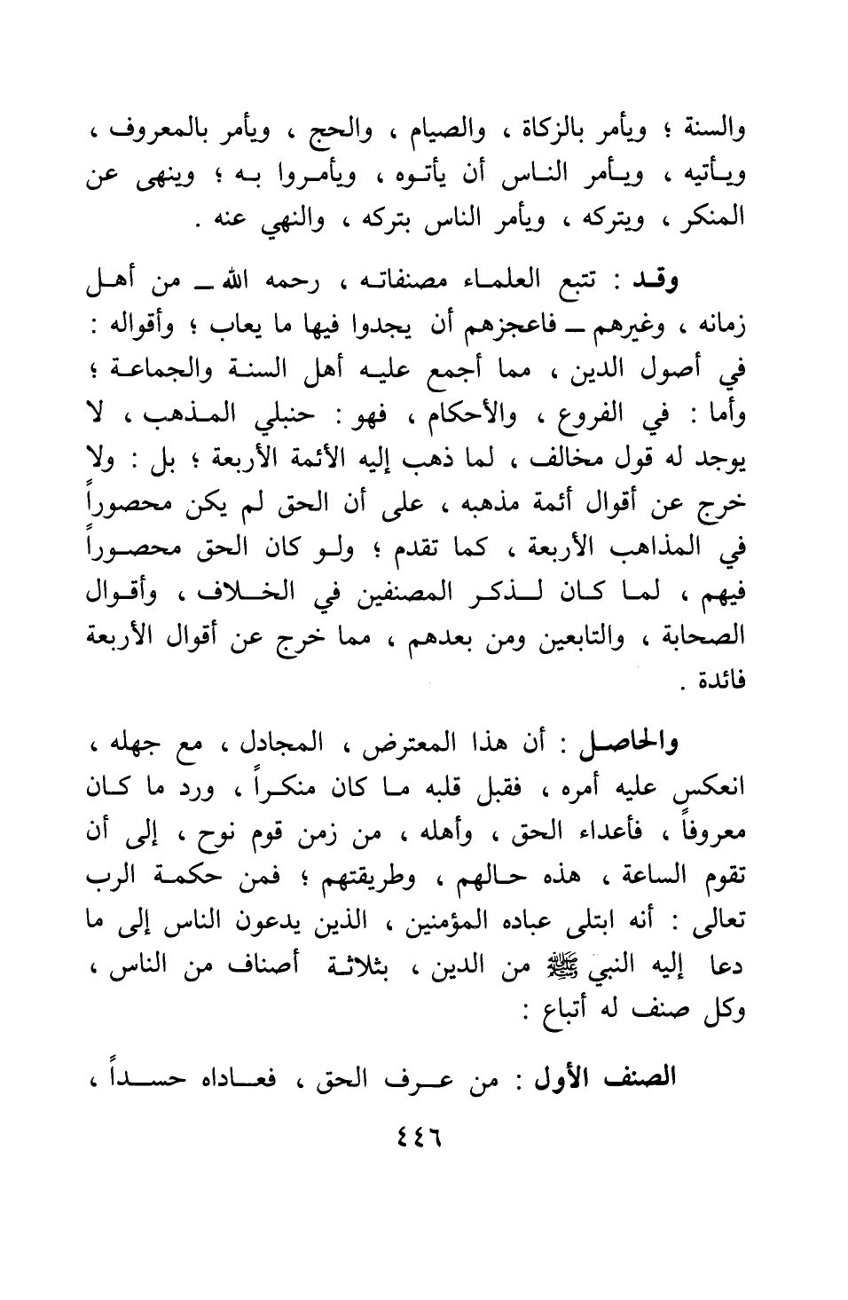 والحاصل: أن هذا المعترض المجادل، مع جهله، انعكس عليه أمره، فقبل قلبه ما كان منكرا، ورد ما كان معروفا، فأعداء الحق، وأهله، من زمن قوم نوح، إلى أن تقوم الساعة، هذه حالهم، وطريقتهم. فمن حكمة الرب تعالى: أنه ابتلى عباده المؤمنين، الذين يدعون الناس إلى ما دعا إليه النبي صلى الله عليه وسلم من الدين، بثلاثة أصناف من الناس، وكل صنف له أتباع: