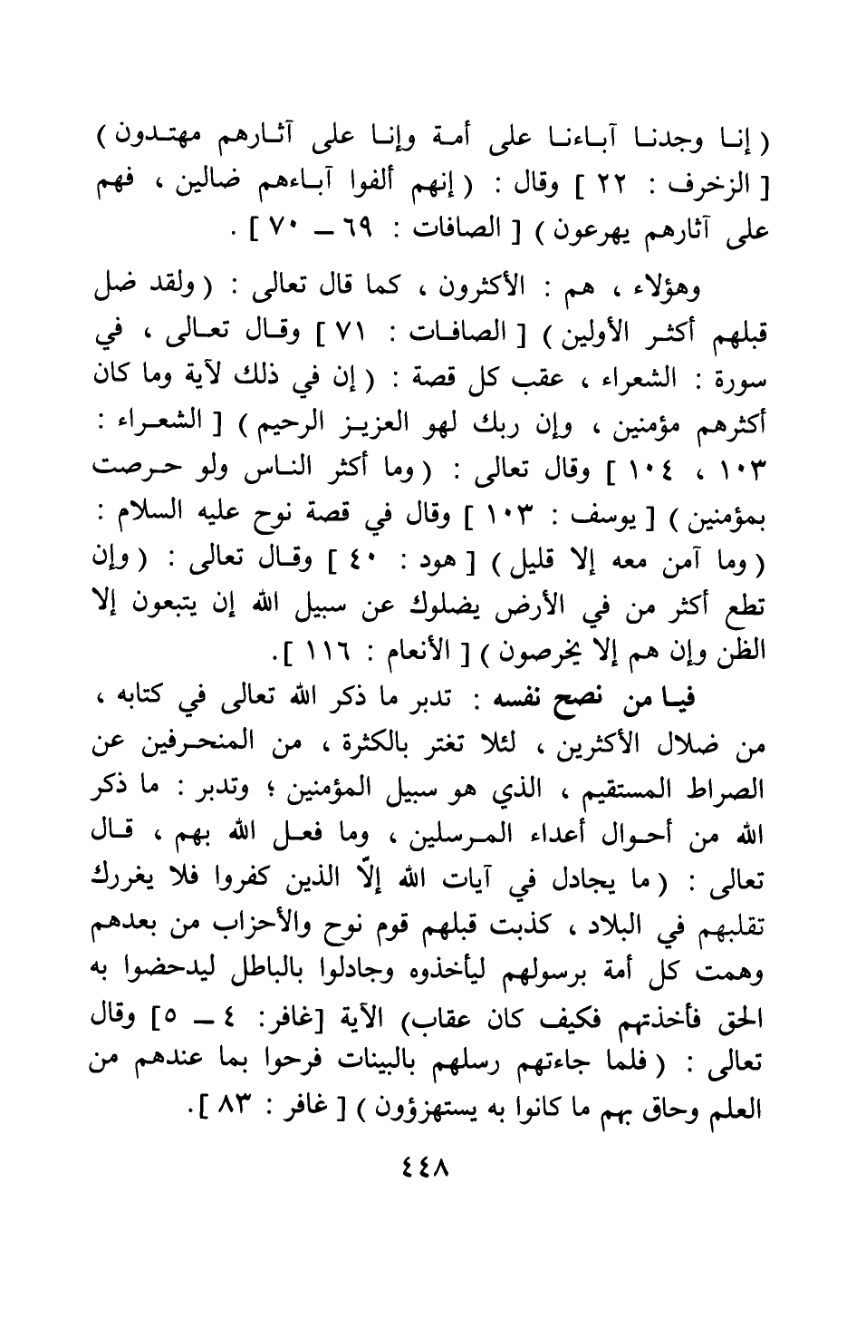 فيا من نصح نفسه تدبر ما ذكر الله تعالى في كتابه، من ضلال الأكثرين، لئلا تغتر بالكثرة من المنحرفين عن الصراط المستقيم الذي هو سبيل المؤمنين، وتدبر ما ذكر الله من أحوال أعداء المرسلين، وما فعل الله بهم، قال تعالى: {مَا يُجَادِلُ فِي آيَاتِ اللَّهِ إِلاَّ الَّذِينَ كَفَرُوا فَلا يَغْرُرْكَ تَقَلُّبُهُمْ فِي الْبِلادِ كَذَّبَتْ قَبْلَهُمْ قَوْمُ نُوحٍ وَالأَحْزَابُ مِنْ بَعْدِهِمْ وَهَمَّتْ كُلُّ أُمَّةٍ بِرَسُولِهِمْ لِيَأْخُذُوهُ وَجَادَلُوا بِالْبَاطِلِ لِيُدْحِضُوا بِهِ الْحَقَّ فَأَخَذْتُهُمْ فَكَيْفَ كَانَ عِقَابِ} [سورة غافر آية: 4-5] الآية وقال تعالى: {فَلَمَّا جَاءَتْهُمْ رُسُلُهُمْ بِالْبَيِّنَاتِ فَرِحُوا بِمَا عِنْدَهُمْ مِنَ الْعِلْمِ وَحَاقَ بِهِمْ مَا كَانُوا بِهِ يَسْتَهْزِئُونَ} [سورة غافر آية: 83] .