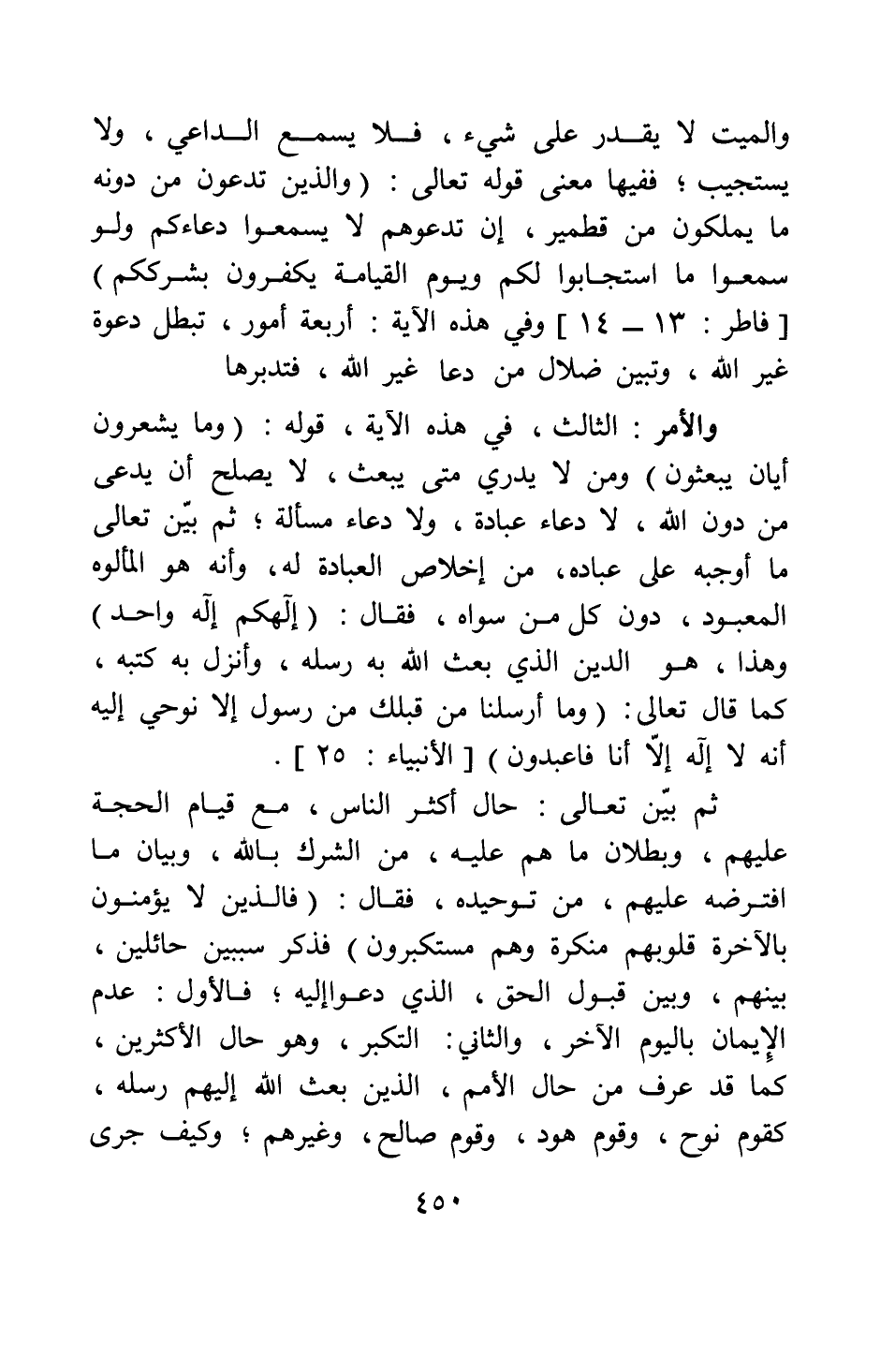 والميت لا يقدر على شيء، فلا يسمع الداعي، ولا يستجيب، ففيها معنى قوله تعالى: {وَالَّذِينَ تَدْعُونَ مِنْ دُونِهِ مَا يَمْلِكُونَ مِنْ قِطْمِيرٍ إِنْ تَدْعُوهُمْ لا يَسْمَعُوا دُعَاءَكُمْ وَلَوْ سَمِعُوا مَا اسْتَجَابُوا لَكُمْ وَيَوْمَ الْقِيَامَةِ يَكْفُرُونَ بِشِرْكِكُمْ} [سورة آية: 13-14] وفي هذه الآية أربعة أمور تبطل دعوة غير الله، وتبين ضلال من دعا غير الله، فتدبرها.