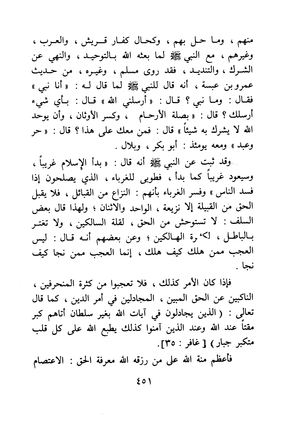 وقد ثبت عن النبي صلى الله عليه وسلم أنه قال: " بدأ الإسلام غريبا، وسيعود غريبا كما بدأ، فطوبى للغرباء، الذي يصلحون إذا فسد الناس " 2 وفسر الغرباء بأنهم: النّزاع من القبائل، فلا يقبل الحق من القبيلة إلا نزيعة، الواحد والاثنان؛ ولهذا قال بعض السلف: " لا تستوحش من الحق لقلة السالكين، ولا تغتر بالباطل لكثرة الهالكين"! وعن بعضهم أنه قال: "ليس العجب ممن هلك كيف هلك، إنما العجب ممن نجا كيف نجا؟ "