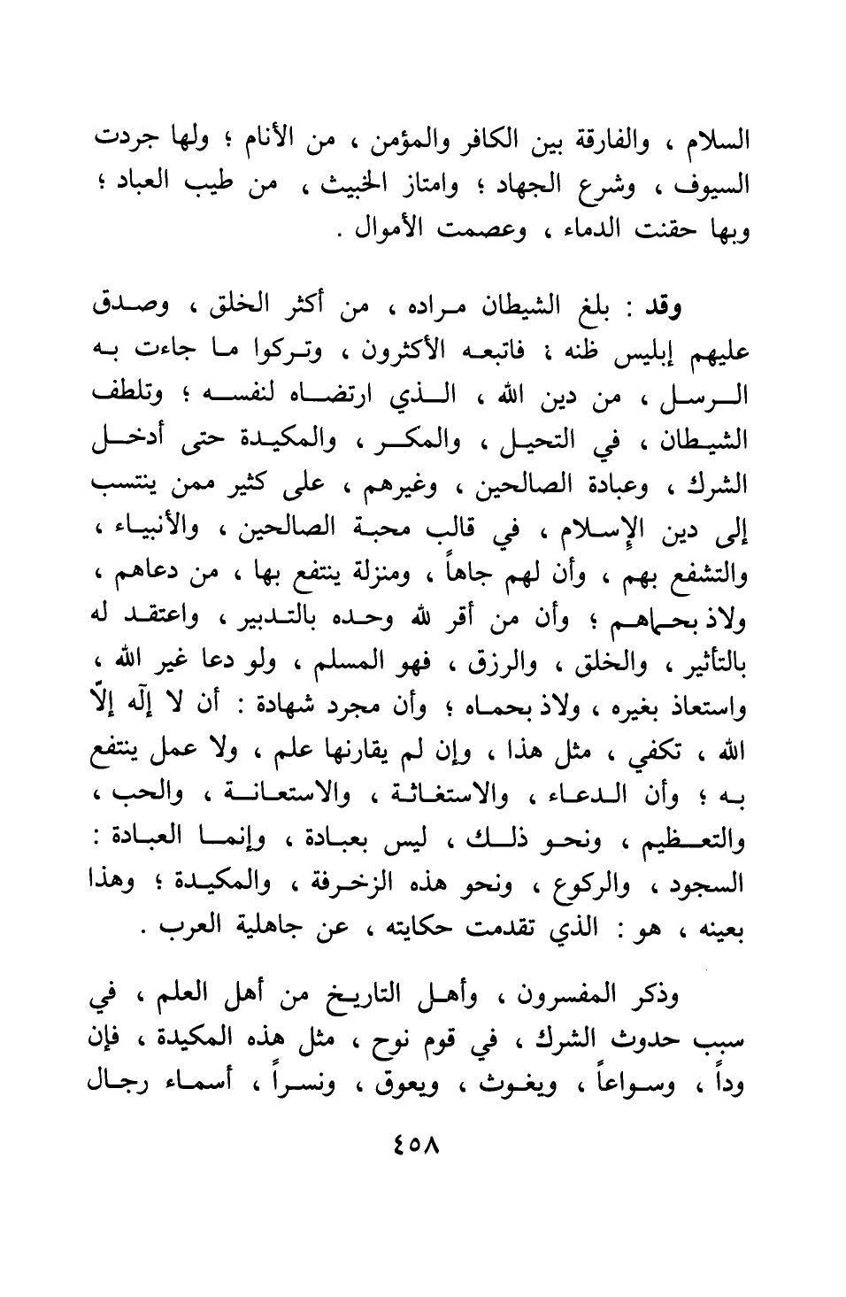وقد بلغ الشيطان مراده من أكثر الخلق، وصدق عليهم إبليس ظنه، فاتبعه الأكثرون، وتركوا ما جاءت به الرسل، من دين الله الذي ارتضاه لنفسه، وتلطف الشيطان في التحيل والمكر والمكيدة حتى أدخل الشرك، وعبادة الصالحين وغيرهم، على كثير ممن ينتسب إلى دين الإسلام في قالب محبة الصالحين والأنبياء، والتشفع بهم، وأن لهم جاها، ومنْزلة ينتفع بها من دعاهم، ولاذ بحماهم؛ وأن من أقر لله وحده بالتدبير، واعتقد له بالتأثير، والخلق، والرزق، فهو المسلم، ولو دعا غير الله، واستعاذ بغيره، ولاذ بحماه؛ وأن مجرد شهادة أن لا إله إلا الله تكفي مثل هذا، وإن لم يقارنها علم ولا عمل ينتفع به، وأن الدعاء والاستغاثة، والاستعانة، والحب، والتعظيم، ونحو ذلك، ليس بعبادة، وإنما العبادة السجود، والركوع، ونحو هذه الزخرفة، والمكيدة; وهذا بعينه هو الذي تقدمت حكايته عن جاهلية العرب.