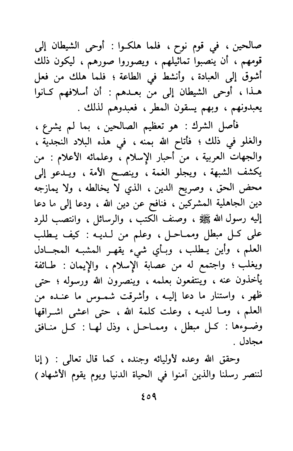 فأصل الشرك: هو تعظيم الصالحين بما لم يشرع. والغلو في ذلك، فأتاح الله بمنه، في هذه البلاد النجدية والجهات العربية، من أحبار الإسلام وعلمائه الأعلام من يكشف الشبهة، ويجلو الغمة، وينصح الأمة، ويدعو إلى محض الحق، وصريح الدين، الذي لا يخالطه، ولا يمازجه دين الجاهلية المشركين، فنافح عن دين الله، ودعا إلى ما دعا إليه رسول الله صلى الله عليه وسلم وصنف الكتب والرسائل، وانتصب للرد على كل مبطل ومماحل، وعلم من لديه كيف يطلب العلم، وأين يطلب، وبأي شيء يقهر المشبه المجادل ويغلب; واجتمع له من عصابة الإسلام، والإيمان طائفة يأخذون عنه، وينتفعون بعلمه، وينصرون الله ورسوله، حتى ظهر واستنار ما دعا إليه، وأشرقت شموس ما عنده من العلم وما لديه، وعلت كلمة الله، حتى أعشى إشراقها وضوءها كل مبطل ومماحل، وذل لها كل منافق مجادل.