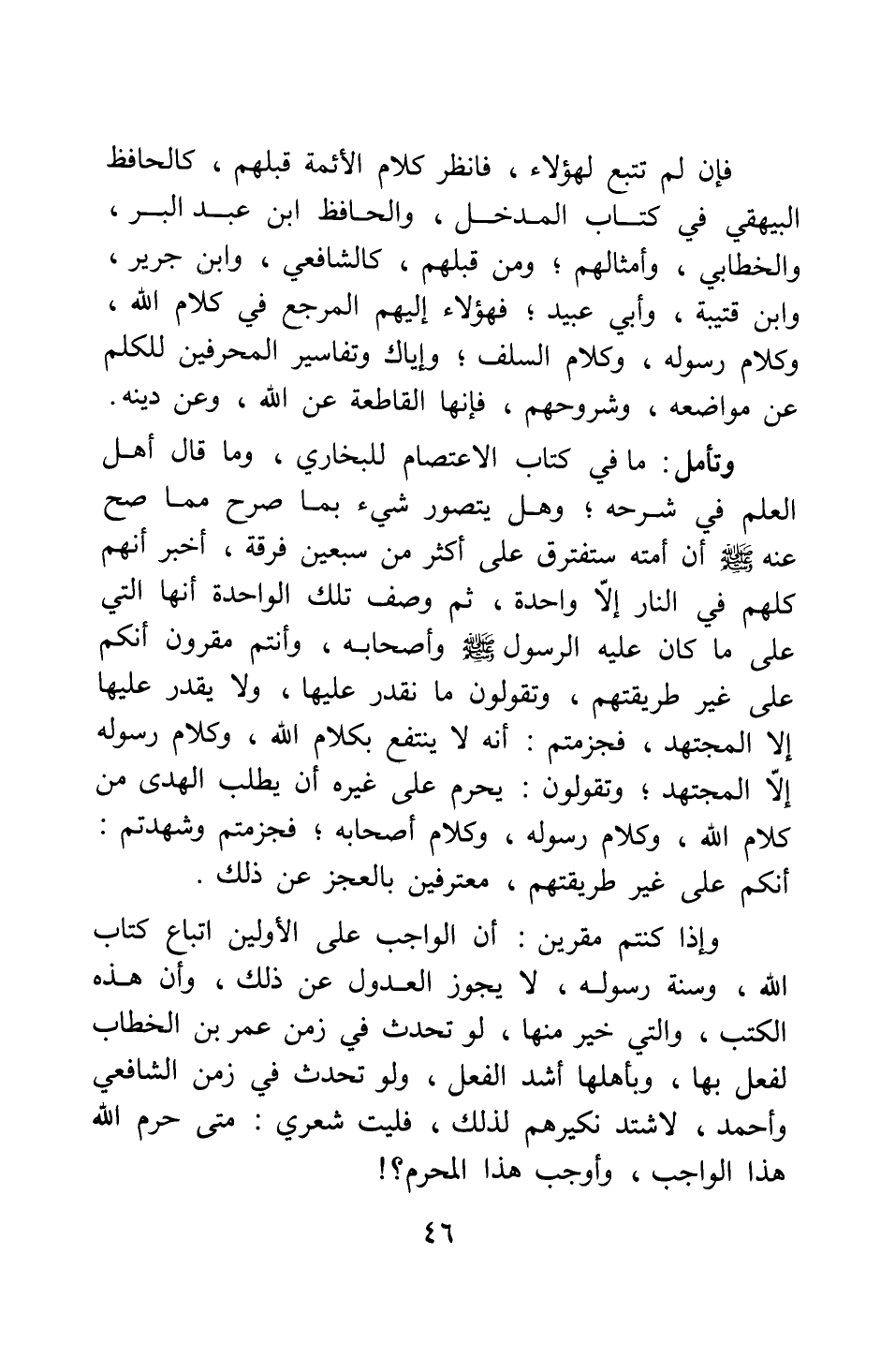 وإذا كنتم مقرين أن الواجب على الأولين اتباع كتاب الله، وسنة رسوله، لا يجوز العدول عن ذلك، وأن هذه الكتب، والتي خير منها، لو تحدث في زمن عمر بن الخطاب لفعل بها وبأهلها أشد الفعل، ولو تحدث في زمن الشافعي وأحمد، لاشتد نكيرهم لذلك، فليت شعري، متى حرم الله هذا الواجب، وأوجب هذا المحرم؟!