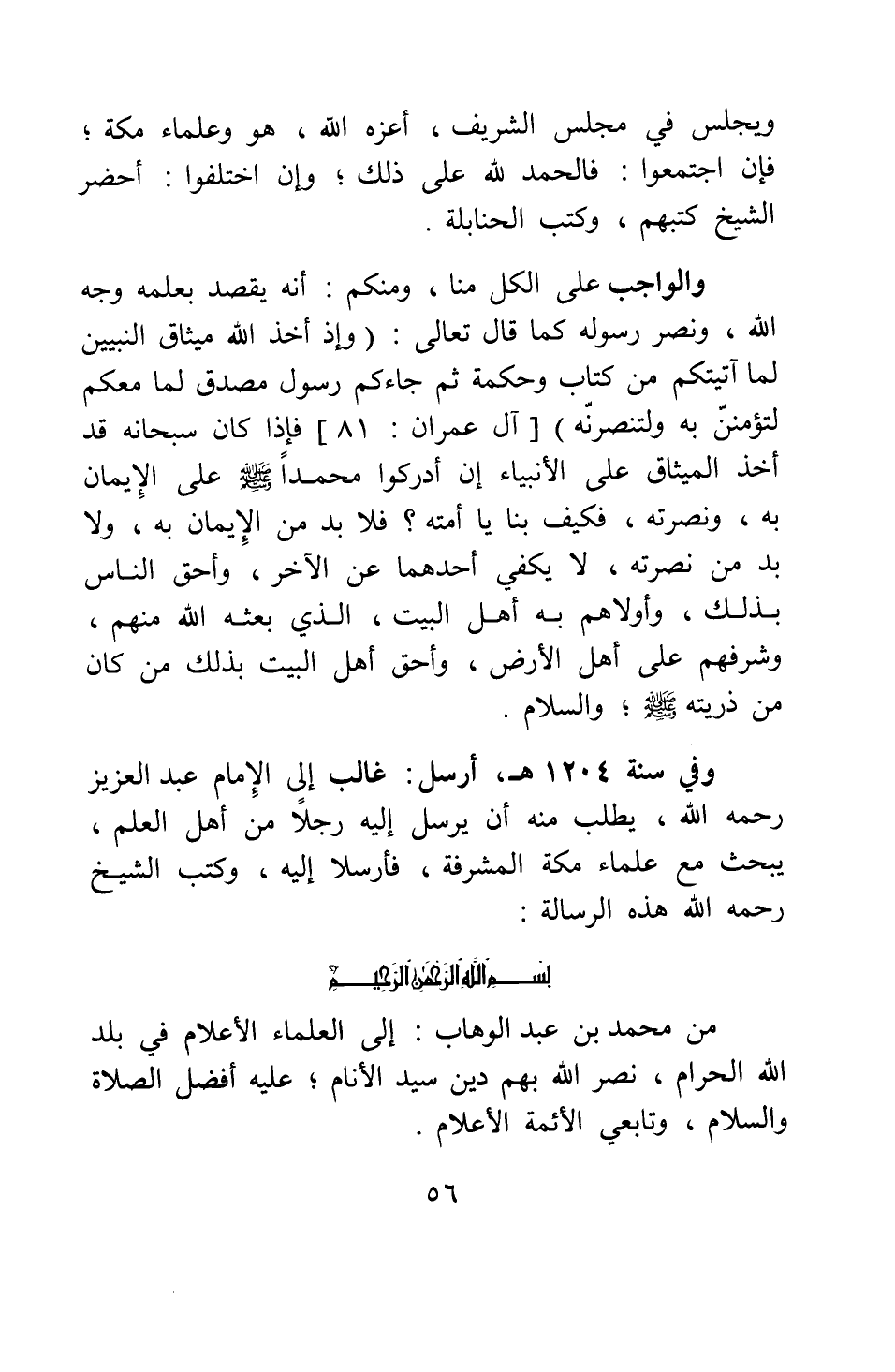 من محمد بن عبد الوهاب إلى العلماء الأعلام في بلد الله الحرام، نصر الله بهم دين سيد الأنام عليه أفضل الصلاة والسلام، وتابعي الأئمة الأعلام.