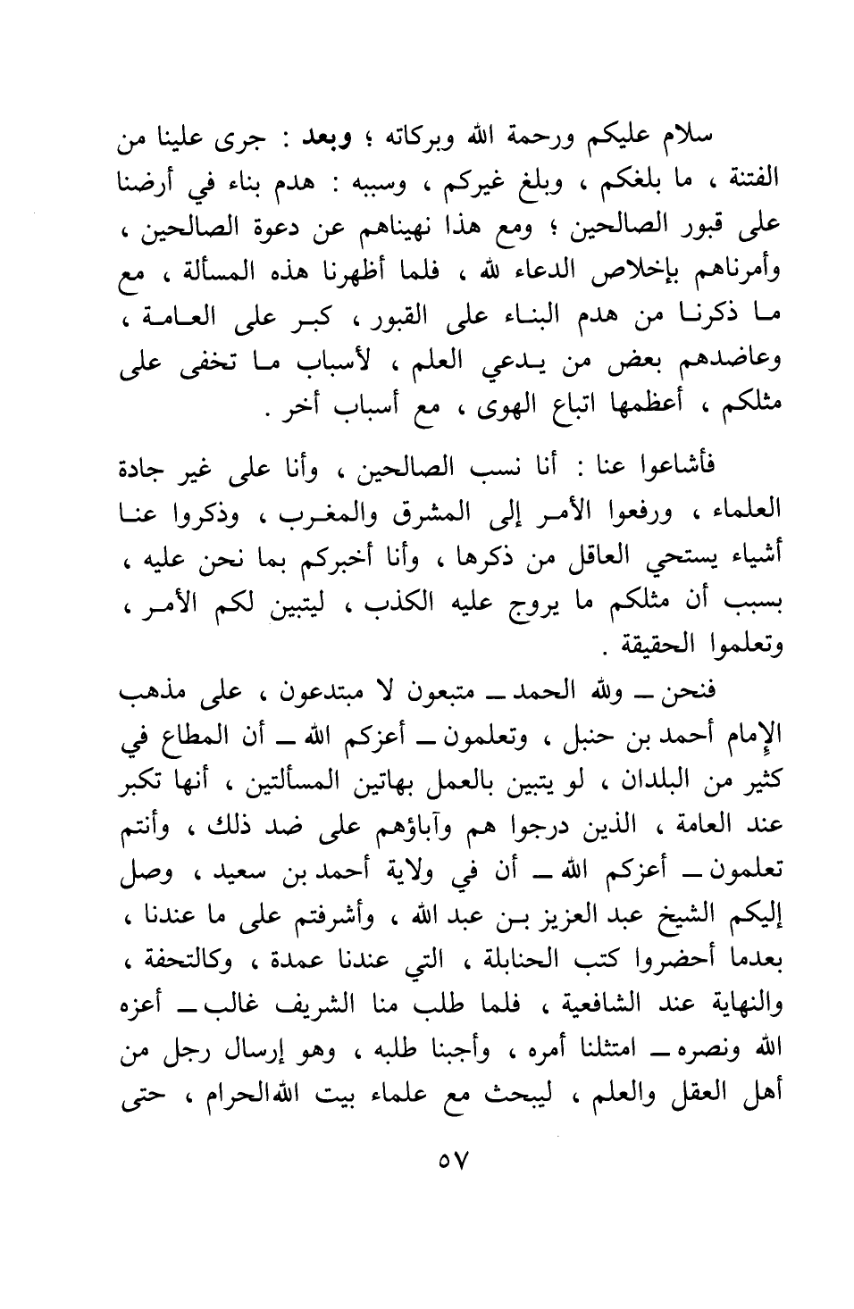 سلام عليكم ورحمة الله وبركاته; وبعد: جرى علينا من الفتنة، ما بلغكم، وبلغ غيركم، وسببه: هدم بناء في أرضنا على قبور الصالحين، ومع هذا نهيناهم عن دعوة الصالحين، وأمرناهم بإخلاص الدعاء لله. فلما أظهرنا هذه المسألة، مع ما ذكرنا من هدم البناء على القبور، كبر على العامة، وعاضدهم بعض من يدعي العلم، لأسباب ما تخفى على مثلكم، أعظمها اتباع الهوى، مع أسباب أخر.
