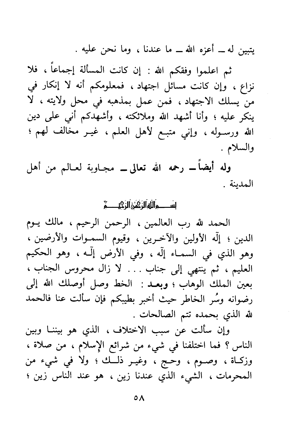 ثم اعلموا وفقكم الله: إن كانت المسألة إجماعا، فلا نزاع، وإن كانت مسائل اجتهاد، فمعلومكم أنه لا إنكار في من يسلك الاجتهاد؛ فمن عمل بمذهبه في محل ولايته، لا ينكر عليه. وأنا أشهد الله وملائكته، وأشهدكم أني على دين الله ورسوله، وإني متبع لأهل العلم، غير مخالف لهم; والسلام.