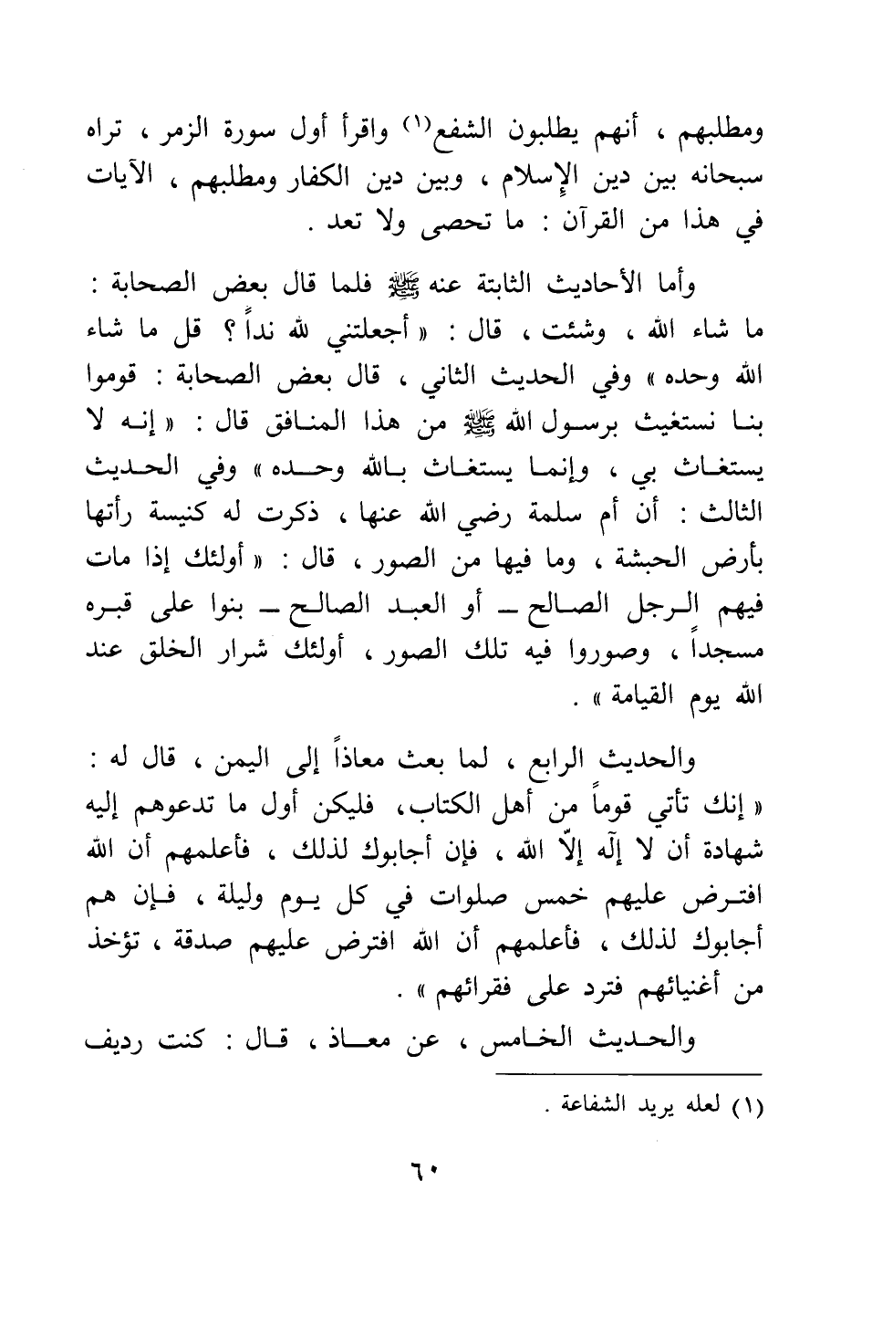 وأما الأحاديث الثابتة عنه صلى الله عليه وسلم فلما قال بعض الصحابة: " ما شاء الله، وشئت، قال: أجعلتني لله ندا؟ قل ما شاء الله وحده ". وفي الحديث الثاني، قال بعض الصحابة: " قوموا بنا نستغيث برسول الله صلى الله عليه وسلم من هذا المنافق. قال: إنه لا يستغاث بي، وإنما يستغاث بالله وحده " 2. وفي الحديث الثالث: " أن أم سلمة رضي الله عنها، ذكرت له كنيسة رأتها بأرض الحبشة، وما فيها من الصور، قال: أولئك إذا مات فيهم الرجل الصالح - أو العبد الصالح - بنوا على قبره مسجدا، وصوروا فيه تلك الصور، أولئك شرار الخلق عند الله يوم القيامة " 3.