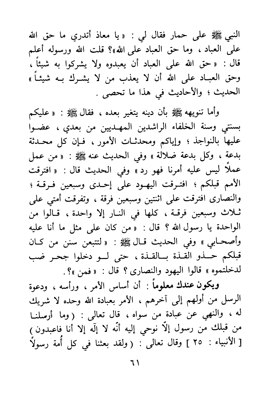 ويكون عندك معلوما: أن أساس الأمر، ورأسه، ودعوة الرسل من أولهم إلى آخرهم، الأمر بعبادة الله وحده لا شريك له، والنهي عن عبادة من سواه، قال تعالى: {وَمَا أَرْسَلْنَا مِنْ قَبْلِكَ مِنْ رَسُولٍ إِلاَّ نُوحِي إِلَيْهِ أَنَّهُ لا إِلَهَ إِلاَّ أَنَا فَاعْبُدُونِ} ، [سورة الأنبياء آية: 25] . وقال تعالى: {وَلَقَدْ بَعَثْنَا فِي كُلِّ أُمَّةٍ رَسُولاً