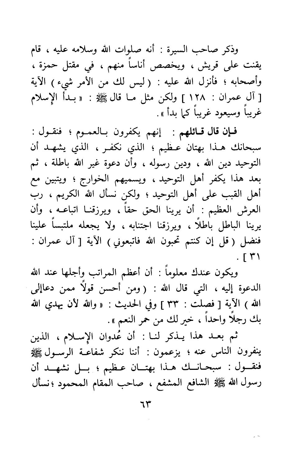 فإن قال قائلهم: إنهم يكفرون بالعموم; فنقول: سبحانك هذا بهتان عظيم، الذي نكفر، الذي يشهد أن التوحيد دين الله، ودين رسوله، وأن دعوة غير الله باطلة، ثم بعد هذا يكفر أهل التوحيد، ويسميهم الخوارج، ويتبين مع أهل القبب على أهل التوحيد; ولكن نسأل الله الكريم، رب العرش العظيم، أن يرينا الحق حقا، ويرزقنا اتباعه، وأن يرينا الباطل باطلا، ويرزقنا اجتنابه، ولا يجعله ملتبسا علينا فنضل. {قُلْ إِنْ كُنْتُمْ تُحِبُّونَ اللَّهَ فَاتَّبِعُونِي} الآية، [سورة آل عمران آية: 31] .