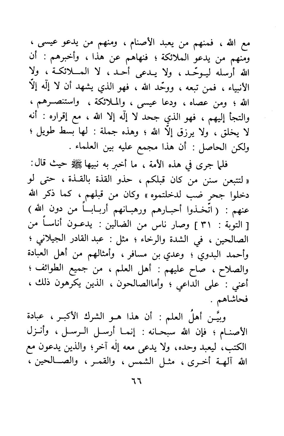 فلما جرى في هذه الأمة، ما أخبر به نبيها صلى الله عليه وسلم حيث قال: " لتتبعن سنن من كان قبلكم، حذو القذة بالقذة، حتى لو دخلوا جحر ضب لدخلتموه " 1، وكان من قبلهم، كما ذكر الله عنهم: {اتَّخَذُوا أَحْبَارَهُمْ وَرُهْبَانَهُمْ أَرْبَاباً مِنْ دُونِ اللَّهِ} [سورة التوبة آية: 31] ، وصار ناس من الضالين يدعون أناسا من الصالحين في الشدة والرخاء، مثل: عبد القادر الجيلاني، وأحمد البدوي، وعدي بن مسافر، وأمثالهم من أهل العبادة والصلاح، صاح عليهم أهل العلم من جميع الطوائف; أعني: على الداعي; وأما الصالحون، الذين يكرهون ذلك، فحاشاهم.