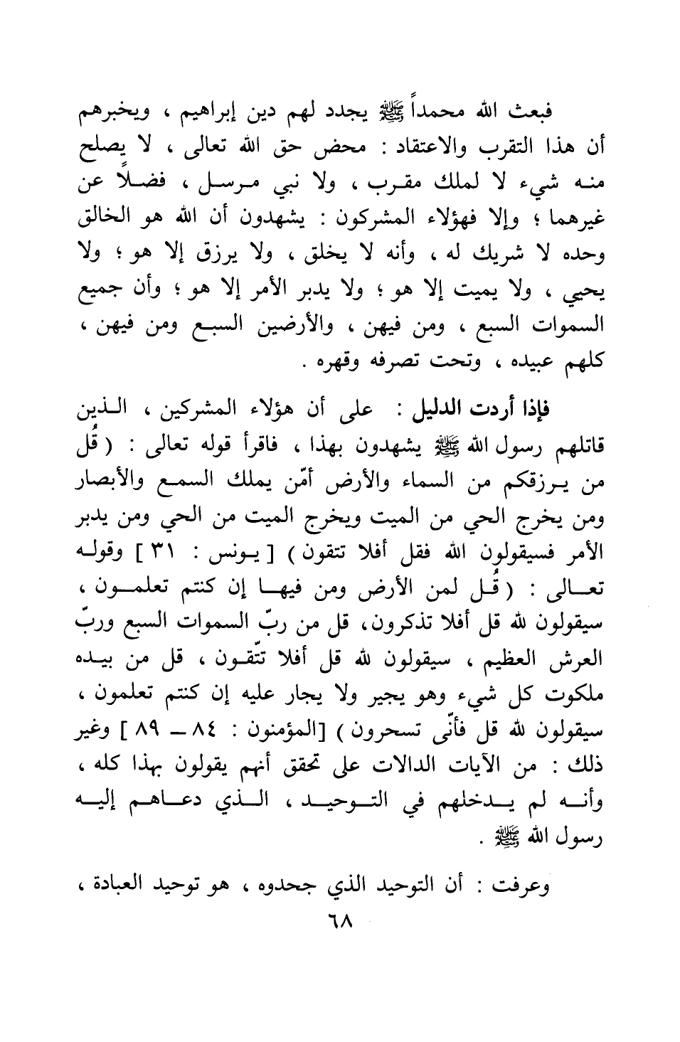 وقوله تعالى: {قُلْ لِمَنِ الأَرْضُ وَمَنْ فِيهَا إِنْ كُنْتُمْ تَعْلَمُونَ سَيَقُولُونَ لِلَّهِ قُلْ أَفَلا تَذَكَّرُونَ قُلْ مَنْ رَبُّ السَّمَاوَاتِ السَّبْعِ وَرَبُّ الْعَرْشِ الْعَظِيمِ سَيَقُولُونَ لِلَّهِ قُلْ أَفَلا تَذَكَّرُونَ قُلْ مَنْ بِيَدِهِ مَلَكُوتُ كُلِّ شَيْءٍ وَهُوَ يُجِيرُ وَلا يُجَارُ عَلَيْهِ إِنْ كُنْتُمْ تَعْلَمُونَ سَيَقُولُونَ لِلَّهِ قُلْ أَفَلا تَذَكَّرُونَ} ، [سورة المؤمنون آية: 84-85-86-87-88-89] . وغير ذلك من الآيات الدالات على تحقق أنهم يقولون بهذا كله، وأنه لم يدخلهم في التوحيد، الذي دعاهم إليه رسول الله صلى الله عليه وسلم، وعرفت أن التوحيد الذي جحدوه، هو توحيد العبادة،