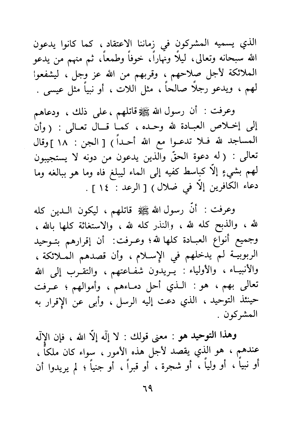 وعرفت: أن رسول الله صلى الله عليه وسلم قاتلهم على ذلك، ودعاهم إلى إخلاص العبادة لله وحده، كما قال تعالى: {وَأَنَّ الْمَسَاجِدَ لِلَّهِ فَلا تَدْعُو مَعَ اللَّهِ أَحَداً} [سورة الجن آية: 18] . وقال تعالى: {لَهُ دَعْوَةُ الْحَقِّ وَالَّذِينَ يَدْعُونَ مِنْ دُونِهِ لا يَسْتَجِيبُونَ لَهُمْ بِشَيْءٍ إِلاَّ كَبَاسِطِ كَفَّيْهِ إِلَى الْمَاءِ لِيَبْلُغَ فَاهُ وَمَا هُوَ بِبَالِغِهِ وَمَا دُعَاءُ الْكَافِرِينَ إِلاَّ فِي ضَلالٍ} [سورة الرعد آية: 14] .