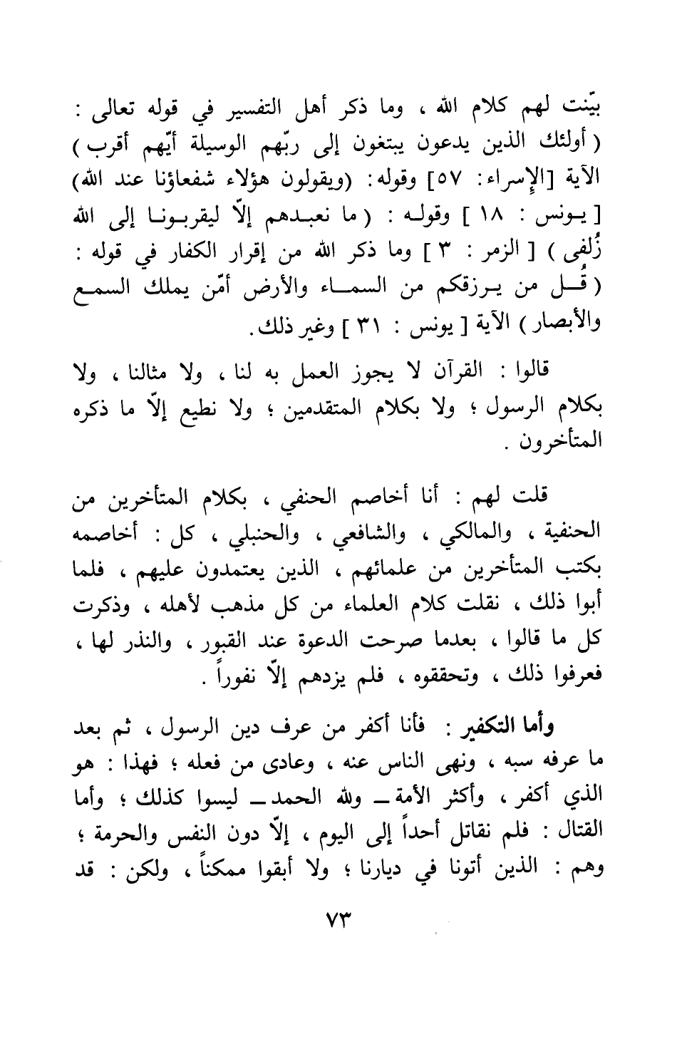 بينت لهم كلام الله، وما ذكر أهل التفسير في قوله تعالى: {أُولَئِكَ الَّذِينَ يَدْعُونَ يَبْتَغُونَ إِلَى رَبِّهِمُ الْوَسِيلَةَ أَيُّهُمْ أَقْرَبُ} الآية [سورة الإسراء آية: 57] . وقوله: {وَيَقُولُونَ هَؤُلاءِ شُفَعَاؤُنَا عِنْدَ اللَّهِ} ، [سورة يونس آية: 18] ، وقوله: {مَا نَعْبُدُهُمْ إِلاَّ لِيُقَرِّبُونَا إِلَى اللَّهِ زُلْفَى} ، [سورة الزمر آية: 3] ، وما ذكر الله من إقرار الكفار في قوله: {قُلْ مَنْ يَرْزُقُكُمْ مِنَ السَّمَاءِ وَالأَرْضِ أَمَّنْ يَمْلِكُ السَّمْعَ وَالأَبْصَارَ} ، الآية [سورة يونس آية: 31] . وغير ذلك، قالوا: القرآن لا يجوز العمل به لنا، ولا مثالنا، ولا بكلام الرسول، ولا بكلام المتقدمين، ولا نطيع إلا ما ذكره المتأخرون.