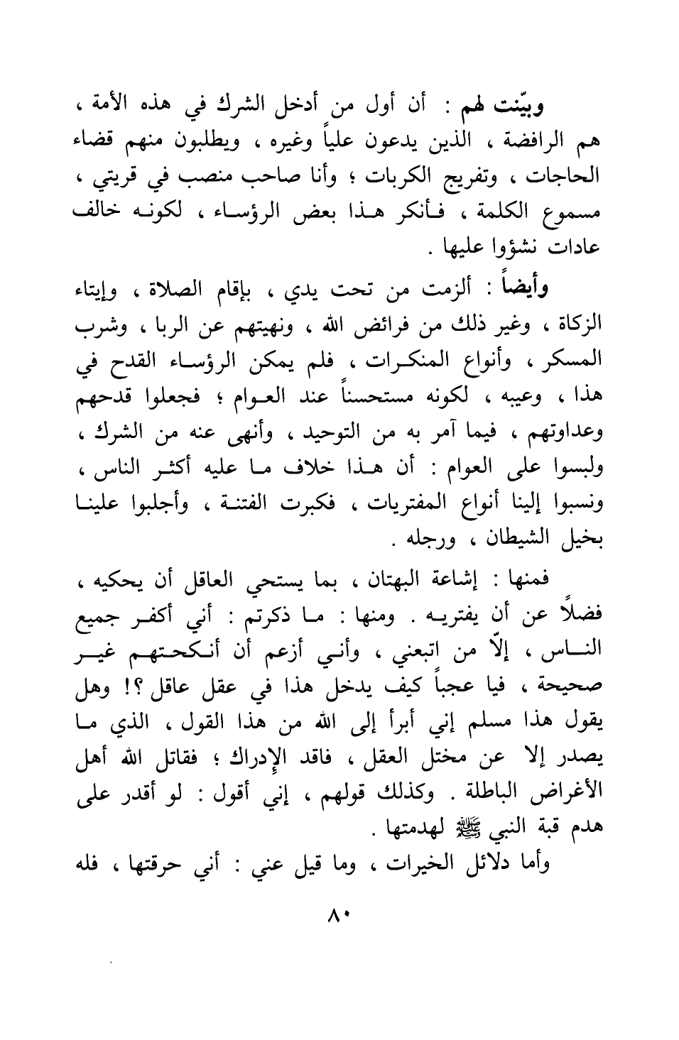 وبينت لهم أن أول من أدخل الشرك في هذه الأمة، هم الرافضة، الذين يدعون عليا وغيره، ويطلبون منهم قضاء الحاجات، وتفريج الكربات; وأنا صاحب منصب في قريتي، مسموع الكلمة، فأنكر هذا بعض الرؤساء، لكونه خالف عادات نشؤوا عليها.