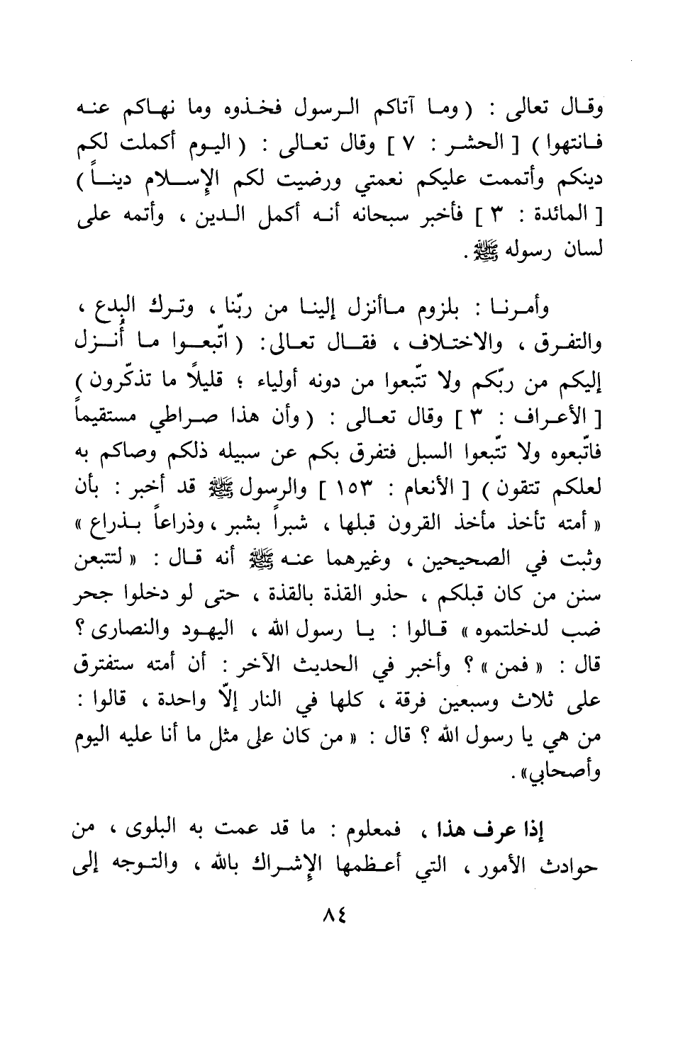 وأمرنا بلزوم ما أنزل إلينا من ربنا، وترك البدع، والتفرق، والاختلاف فقال تعالى: {اتَّبِعُوا مَا أُنْزِلَ إِلَيْكُمْ مِنْ رَبِّكُمْ وَلا تَتَّبِعُوا مِنْ دُونِهِ أَوْلِيَاءَ قَلِيلاً مَا تَذَكَّرُونَ} ، [سورة الأعراف آية: 3] ، وقال تعالى: {وَأَنَّ هَذَا صِرَاطِي مُسْتَقِيماً فَاتَّبِعُوهُ وَلا تَتَّبِعُوا السُّبُلَ فَتَفَرَّقَ بِكُمْ عَنْ سَبِيلِهِ ذَلِكُمْ وَصَّاكُمْ بِهِ لَعَلَّكُمْ تَتَّقُونَ} [سورة الأنعام آية: 153] . والرسول صلى الله عليه وسلم قد أخبر: بأن " أمته تأخذ مأخذ القرون قبلها، شبرا بشبر، وذراعا بذراع " 1 وثبت في الصحيحين، وغيرهما عنه صلى الله عليه وسلم أنه قال: " لتتبعن سنن من كان قبلكم، حذو القذة بالقذة، حتى لو دخلوا جحر ضب لدخلتموه. قالوا: يا رسول الله، اليهود والنصارى؟ قال: فمن؟ " 2 وأخبر في الحديث الآخر: " أن أمته ستفترق على ثلاث وسبعين فرقة، كلها في النار إلا واحدة، قالوا: من هي يا رسول الله؟ قال: من كان على مثل ما أنا عليه اليوم وأصحابي " 3. إذا عرف هذا، فمعلوم ما قد عمت به البلوى، من حوادث الأمور، التي أعظمها الإشراك بالله، والتوجه إلى