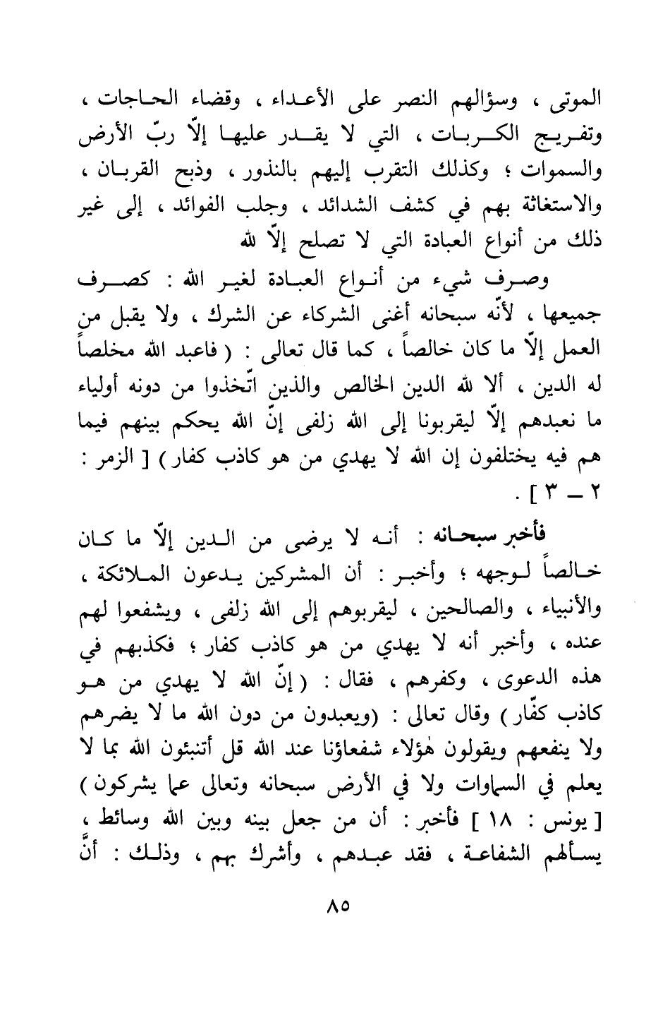 الموتى، وسؤالهم النصر على الأعداء، وقضاء الحاجات، وتفريج الكربات، التي لا يقدر عليها إلا رب الأرض والسماوات، وكذلك التقرب إليهم بالنذور، وذبح القربان، والاستغاثة بهم في كشف الشدائد، وجلب الفوائد، إلى غير ذلك من أنواع العبادة التي لا تصلح إلا لله؛ وصرف شيء من أنواع العبادة لغير الله كصرف جميعها، لأنه سبحانه أغنى الشركاء عن الشرك، ولا يقبل من العمل إلا ما كان خالصا، كما قال تعالى: {فَاعْبُدِ اللَّهَ مُخْلِصاً لَهُ الدِّينَ أَلا لِلَّهِ الدِّينُ الْخَالِصُ وَالَّذِينَ اتَّخَذُوا مِنْ دُونِهِ أَوْلِيَاءَ مَا نَعْبُدُهُمْ إِلاَّ لِيُقَرِّبُونَا إِلَى اللَّهِ زُلْفَى إِنَّ اللَّهَ يَحْكُمُ بَيْنَهُمْ فِي مَا هُمْ فِيهِ يَخْتَلِفُونَ إِنَّ اللَّهَ لا يَهْدِي مَنْ هُوَ كَاذِبٌ كَفَّارٌ} [سورة الزّمر الآيتان: 2-3] ، فأخبر سبحانه أنه لا يرضى من الدين إلا ما كان خالصا لوجهه; وأخبر: أن المشركين يدعون الملائكة، والأنبياء، والصالحين، ليقربوهم إلى الله زلفى، ويشفعوا لهم عنده. وأخبر أنه لا يهدي من هو كاذب كفار؛ فكذبهم في هذه الدعوى، وكفرهم، فقال: {إِنَّ اللَّهَ لا يَهْدِي مَنْ هُوَ كَاذِبٌ كَفَّارٌ} [سورة الزمر آية: 3] . وقال تعالى: {وَيَعْبُدُونَ مِنْ دُونِ اللَّهِ مَا لا يَضُرُّهُمْ وَلا يَنْفَعُهُمْ وَيَقُولُونَ هَؤُلاءِ شُفَعَاؤُنَا عِنْدَ اللَّهِ قُلْ أَتُنَبِّئُونَ اللَّهَ بِمَا لا يَعْلَمُ فِي السَّمَاوَاتِ وَلا فِي الأَرْضِ سُبْحَانَهُ وَتَعَالَى عَمَّا يُشْرِكُونَ} [سورة يونس آية: 18] .