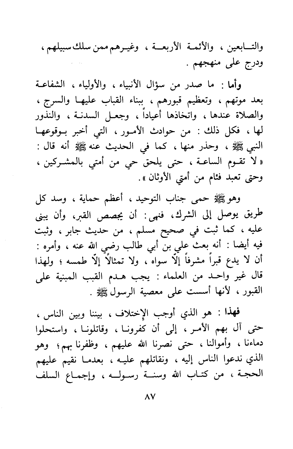 وثبت فيه أيضا: " أنه بعث علي ابن أبي طالب رضي الله عنه وأمره: أن لا يدع قبرا مشرفا إلا سواه، ولا تمثالا إلا طمسه " 1، ولهذا قال غير واحد من العلماء: يجب هدم القبب المبنية على القبور، لأنها أسست على معصية الرسول صلى الله عليه وسلم. فهذا هو الذي أوجب الاختلاف، بيننا وبين الناس، حتى آل بهم الأمر، إلى أن كفرونا، وقاتلونا، واستحلوا دماءنا، وأموالنا، حتى نصرنا الله عليهم، وظفرنا بهم; وهو الذي ندعو الناس إليه، ونقاتلهم عليه، بعدما نقيم عليهم الحجة، من كتاب الله وسنة رسوله، وإجماع السلف