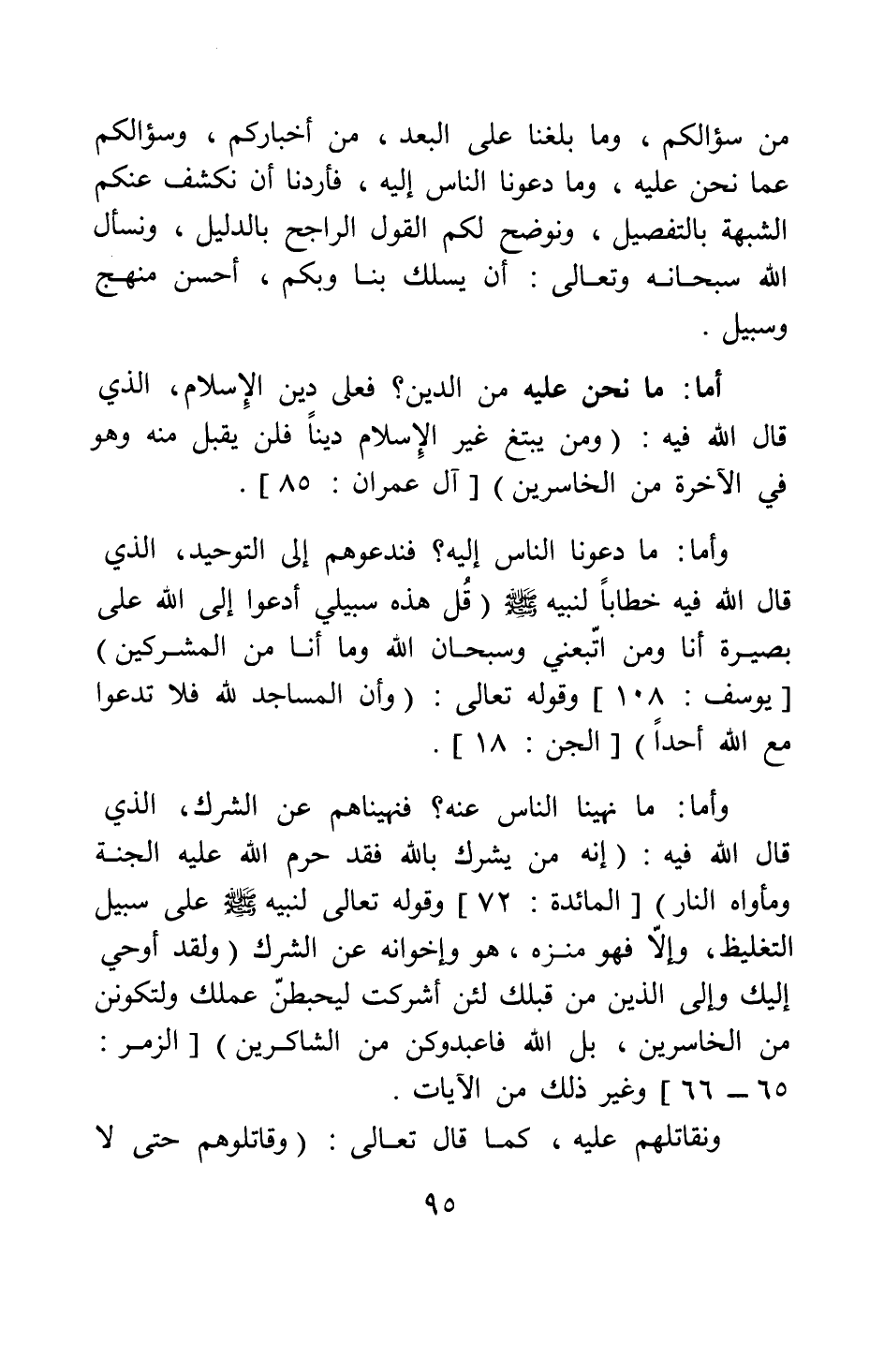 وأما ما دعونا الناس إليه؟ فندعوهم إلى التوحيد، الذي قال الله فيه خطابا لنبيه صلى الله عليه وسلم: {قُلْ هَذِهِ سَبِيلِي أَدْعُو إِلَى اللَّهِ عَلَى بَصِيرَةٍ أَنَا وَمَنِ اتَّبَعَنِي وَسُبْحَانَ اللَّهِ وَمَا أَنَا مِنَ الْمُشْرِكِينَ} [سورة يوسف آية: 108] ، وقوله تعالى: {وَأَنَّ الْمَسَاجِدَ لِلَّهِ فَلا تَدْعُو مَعَ اللَّهِ أَحَداً} [سورة الجن آية: 18] .