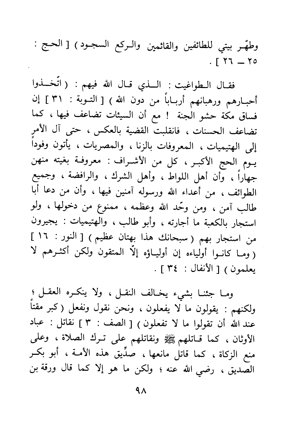 وَطَهِّرْ بَيْتِيَ لِلطَّائِفِينَ وَالْقَائِمِينَ وَالرُّكَّعِ السُّجُودِ} ، [الحج الآيتان: 25-26] ، فقال الطواغيت الذي قال الله فيهم: {اتَّخَذُوا أَحْبَارَهُمْ وَرُهْبَانَهُمْ أَرْبَاباً مِنْ دُونِ اللَّهِ} [سورة التوبة آية: 31] . إن فساق مكة حشو الجنة! مع أن السيئات تضاعف فيها، كما تضاعف الحسنات، قانقلبت القضية بالعكس، حتى آل الأمر إلى الهتيميات، المعروفات بالزنى، والمصريات، يأتون وفودا يوم الحج الأكبر، كل من الأشراف معروفة بغيته منهن جهارا، وأن أهل اللواط، وأهل الشرك، والرافضة، وجميع الطوائف، من أعداء الله ورسوله آمنين فيها، وأن من دعا أبا طالب آمن، ومن وحد الله وعظمه ممنوع من دخولها، ولو استجار بالكعبة ما أجارته، وأبو طالب والهتيميات يجيرون من استجار بهم {سُبْحَانَكَ هَذَا بُهْتَانٌ عَظِيمٌ} [سورة النور آية: 16] . {وَمَا كَانُوا أَوْلِيَاءَهُ إِنْ أَوْلِيَاؤُهُ إِلاَّ الْمُتَّقُونَ وَلَكِنَّ أَكْثَرَهُمْ لا يَعْلَمُونَ} [سورة الأنفال آية: 34] .