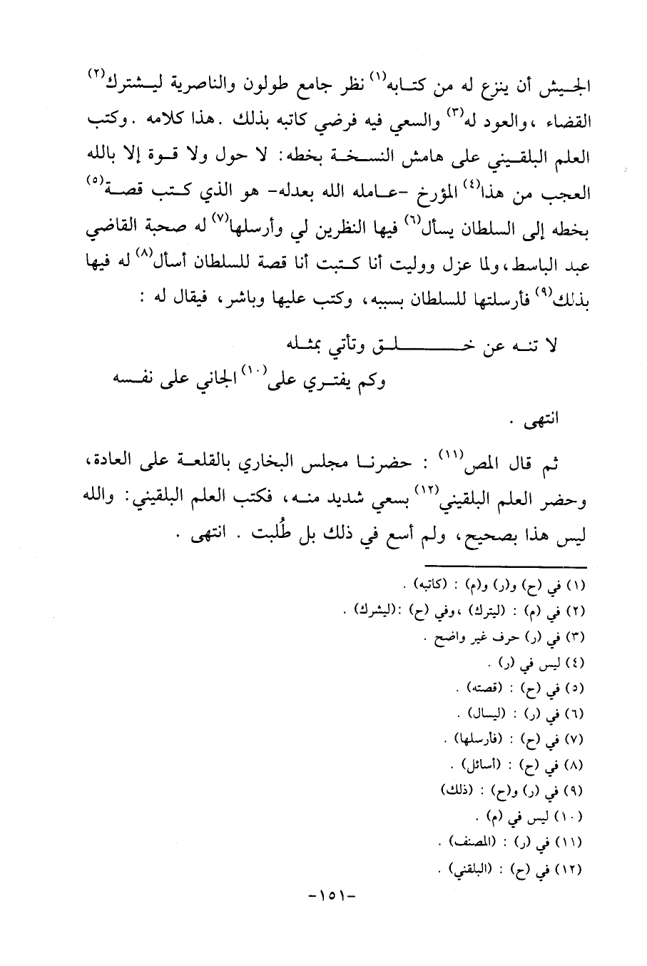 الْجَيْش أَن ينْزع لَهُ من كِتَابه نظر جَامع طولون والناصرية ليشترك الْقَضَاء، وَالْعود لَهُ وَالسَّعْي فِيهِ فَرضِي كَاتبه بذلك. هَذَا كَلَامه. وَكتب الْعلم البُلْقِينِيّ على هَامِش النُّسْخَة بِخَطِّهِ: لَا حول وَلَا قُوَّة إِلَّا بِاللَّه الْعجب من هَذَا المؤرخ - عَامله الله بعدله - هُوَ الَّذِي كتب قصَّة بِخَطِّهِ إِلَى السُّلْطَان يسْأَل فِيهَا النظرين لي وأرسلها لَهُ صُحْبَة القَاضِي عبد الباسط، وَلما عزل وَوليت أَنا كتبت أَنا قصَّة للسُّلْطَان أسأَل لَهُ فِيهَا بذلك فأرسلتها للسُّلْطَان بِسَبَبِهِ، وَكتب عَلَيْهَا وباشر، فَيُقَال لَهُ:
